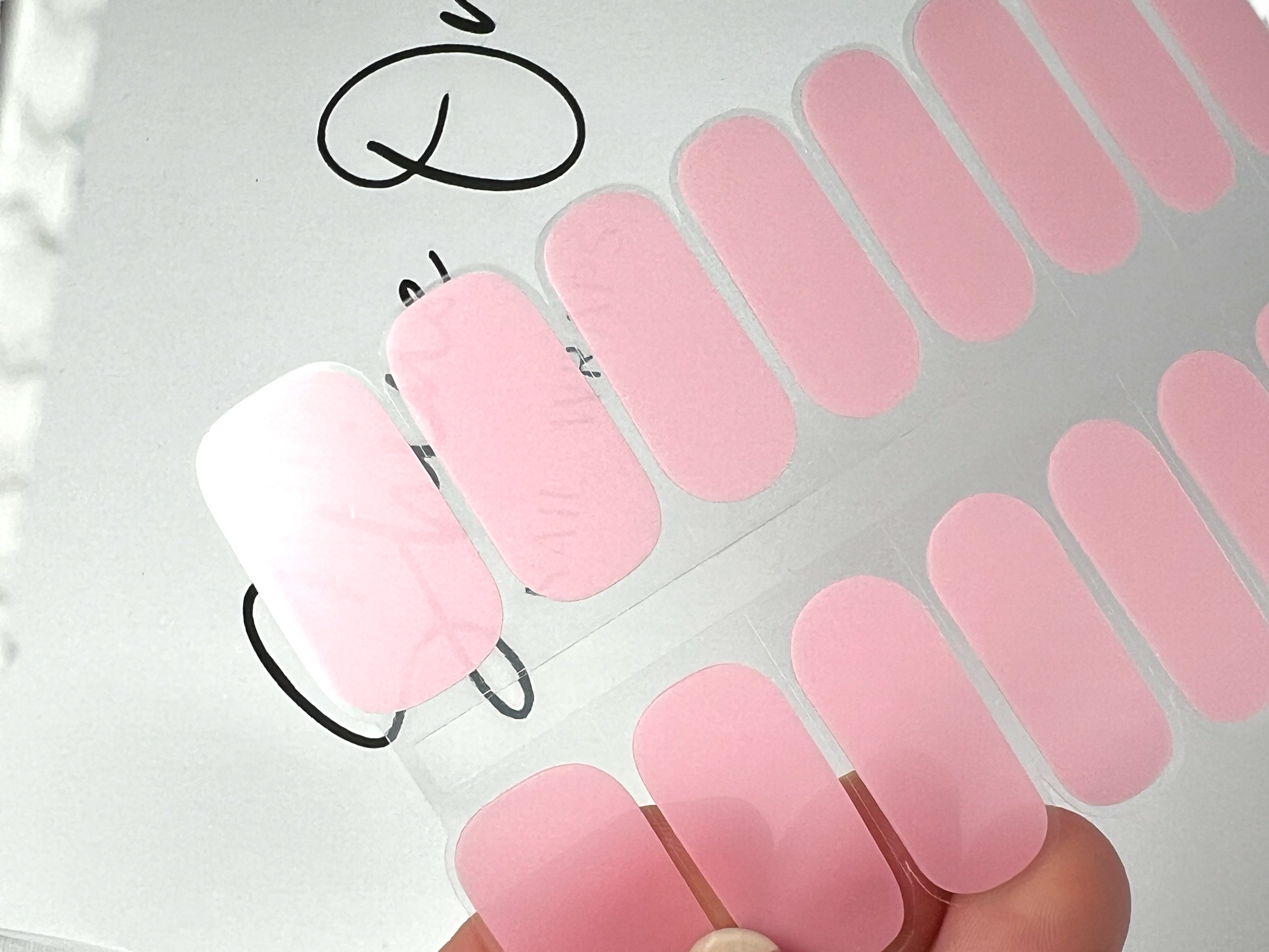 16 SEMI-CURED UV GEL WRAPS IN A SEMI TRANSPARENT PINK WITH A RED IRIDESCENCE.