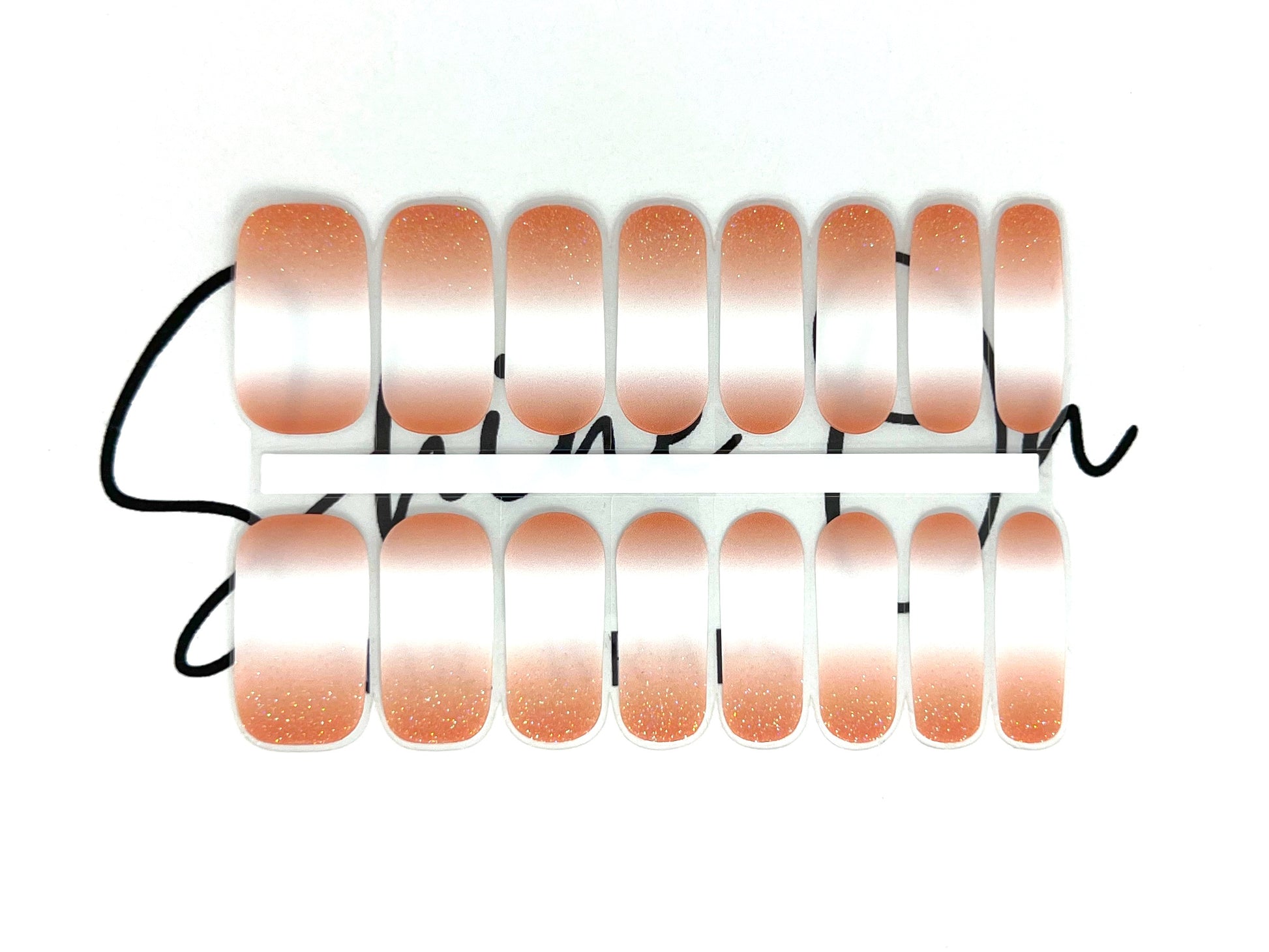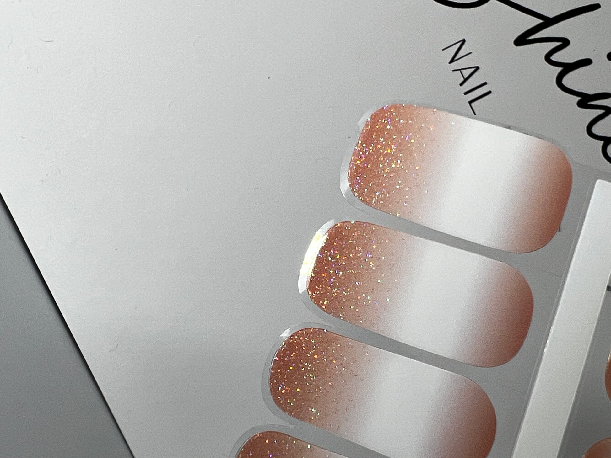 16 SEMI-CURED UV GEL WRAPS IN A NUDE/TAN TO WHITE OMBRÉ FEATURING A FINE HOLOGRAPHIC GLITTER AT THE CUTICLE