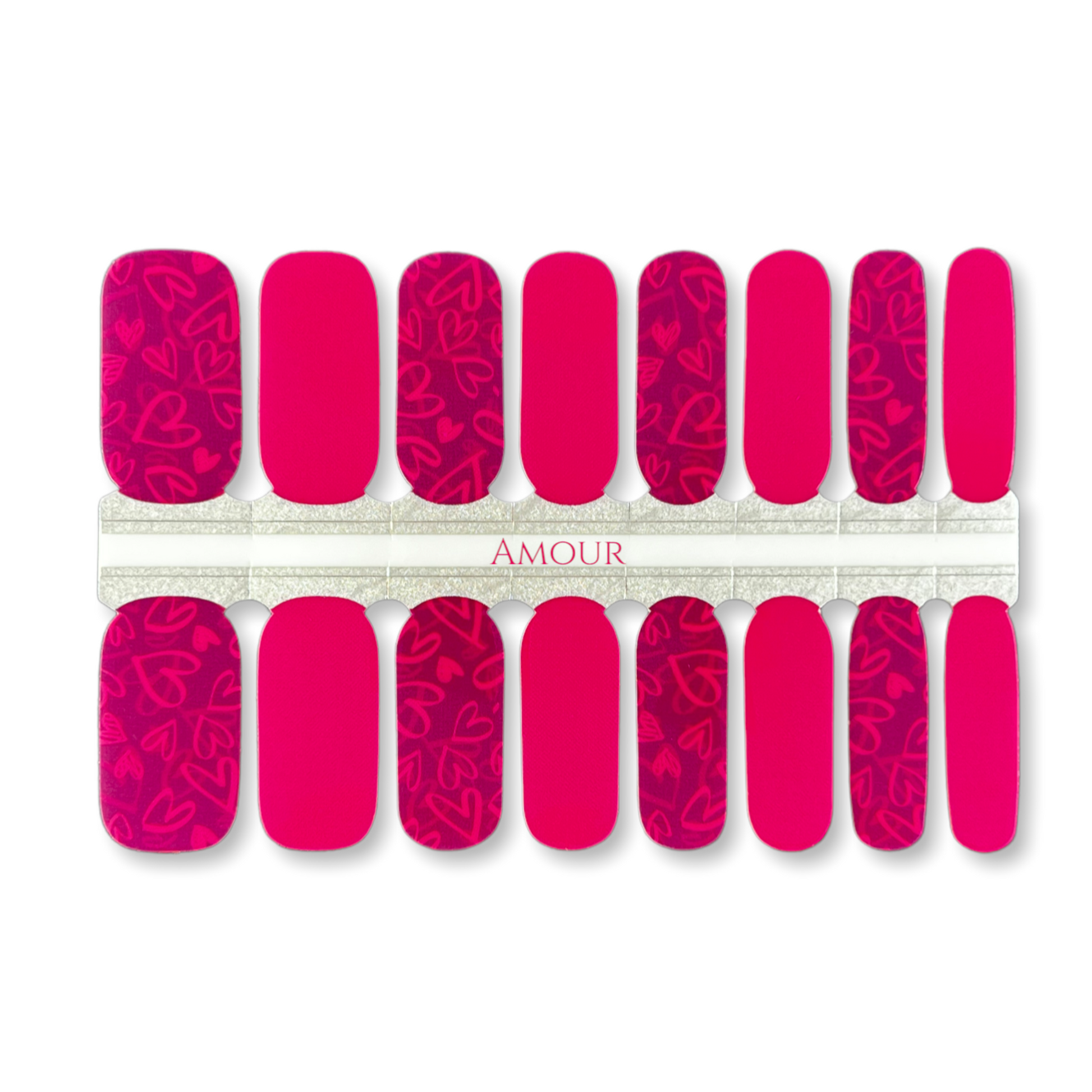 16 REAL NAIL POLISH STRIPS IN DEEP PINK TONES FEATURING A MULTI HEART DESIGN ON ALTERNATING STRIPS