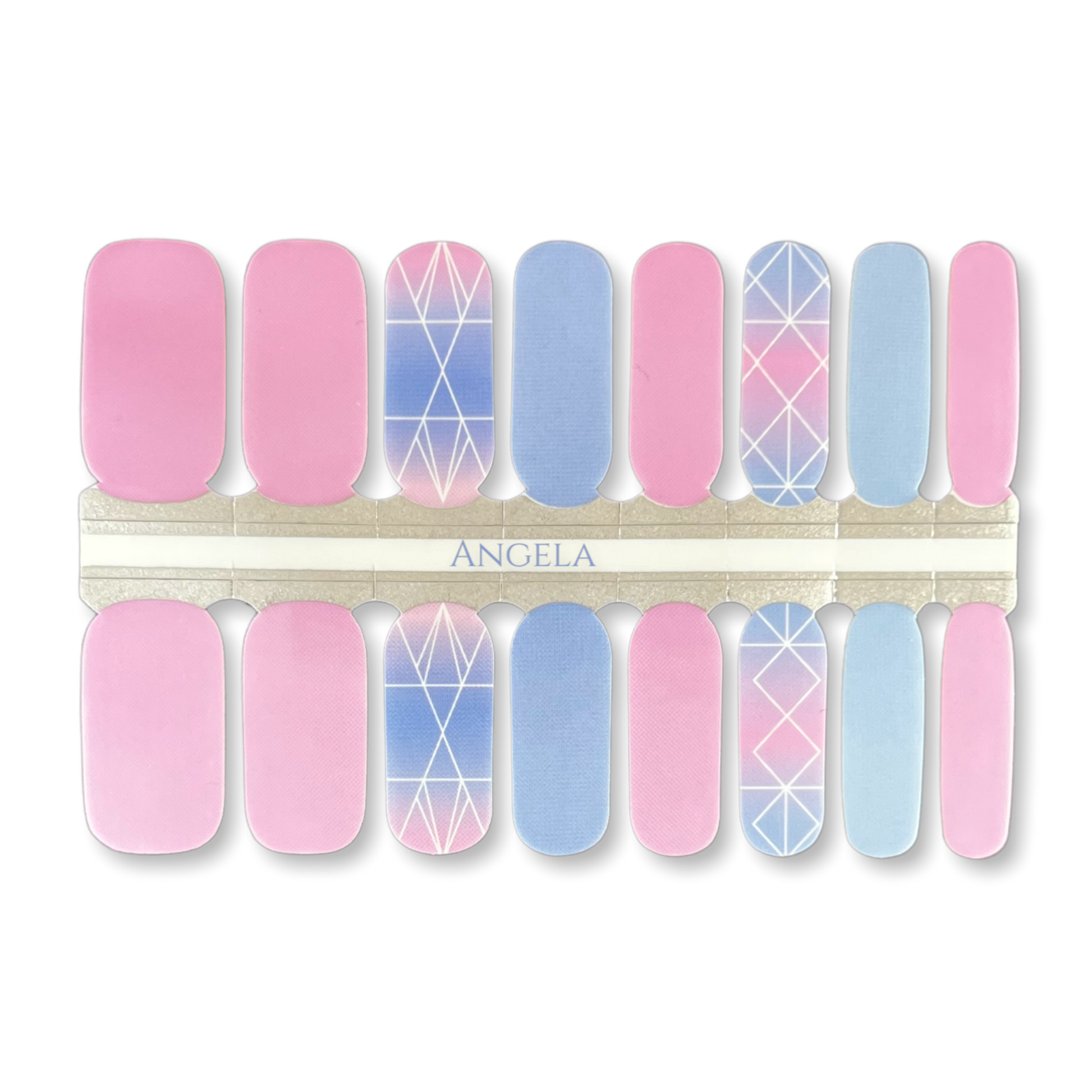 16 REAL NAIL POLISH STRIPS IN PINK AND BLUE WITH PINK/BLUE OMBRÉ ACCENTS WITH WHITE GEOMETRIC DESIGN