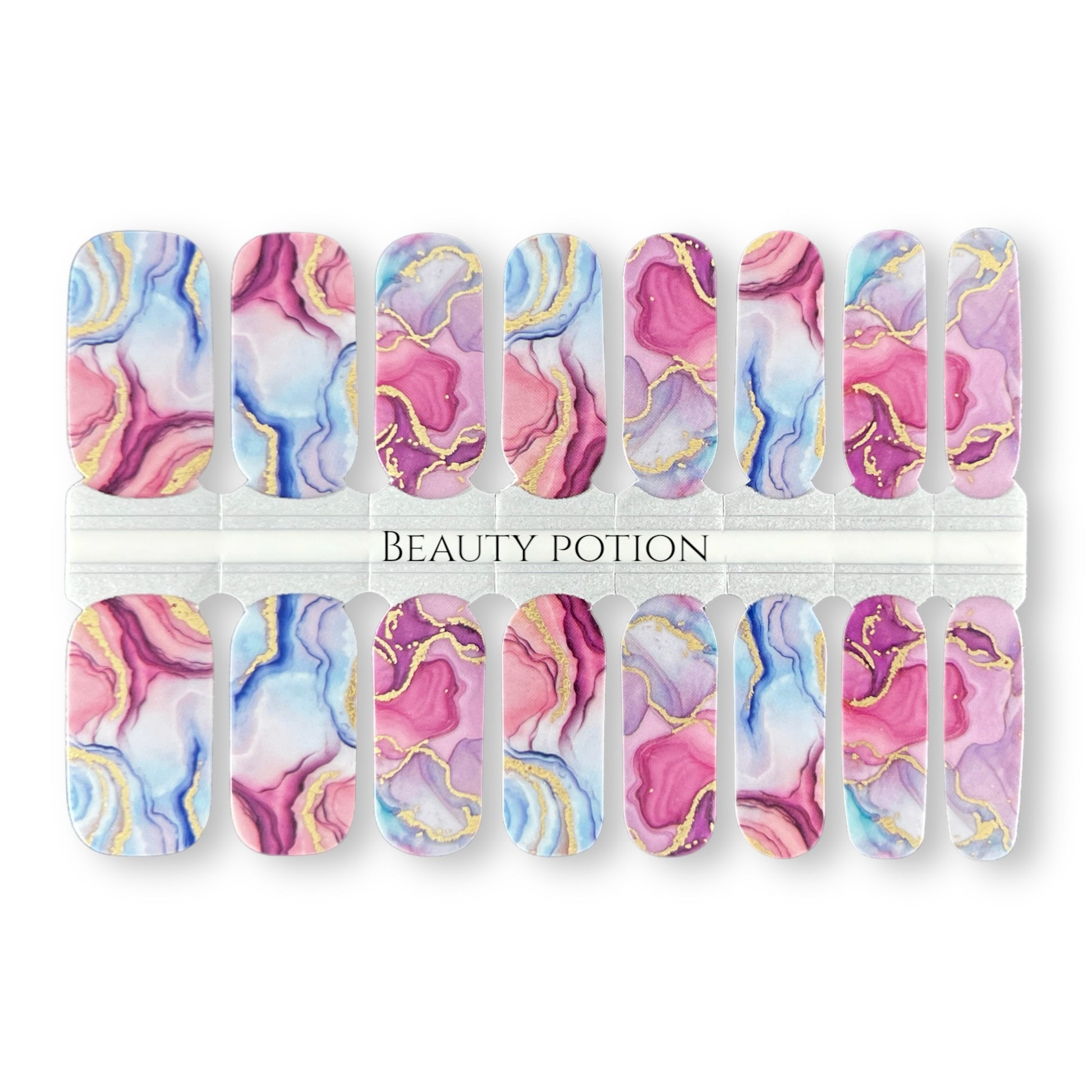 16 REAL NAIL POLISH STRIPS IN A BLUE AND FUSCIA COLOUR BLOOM WITH GOLD FOIL VEINING