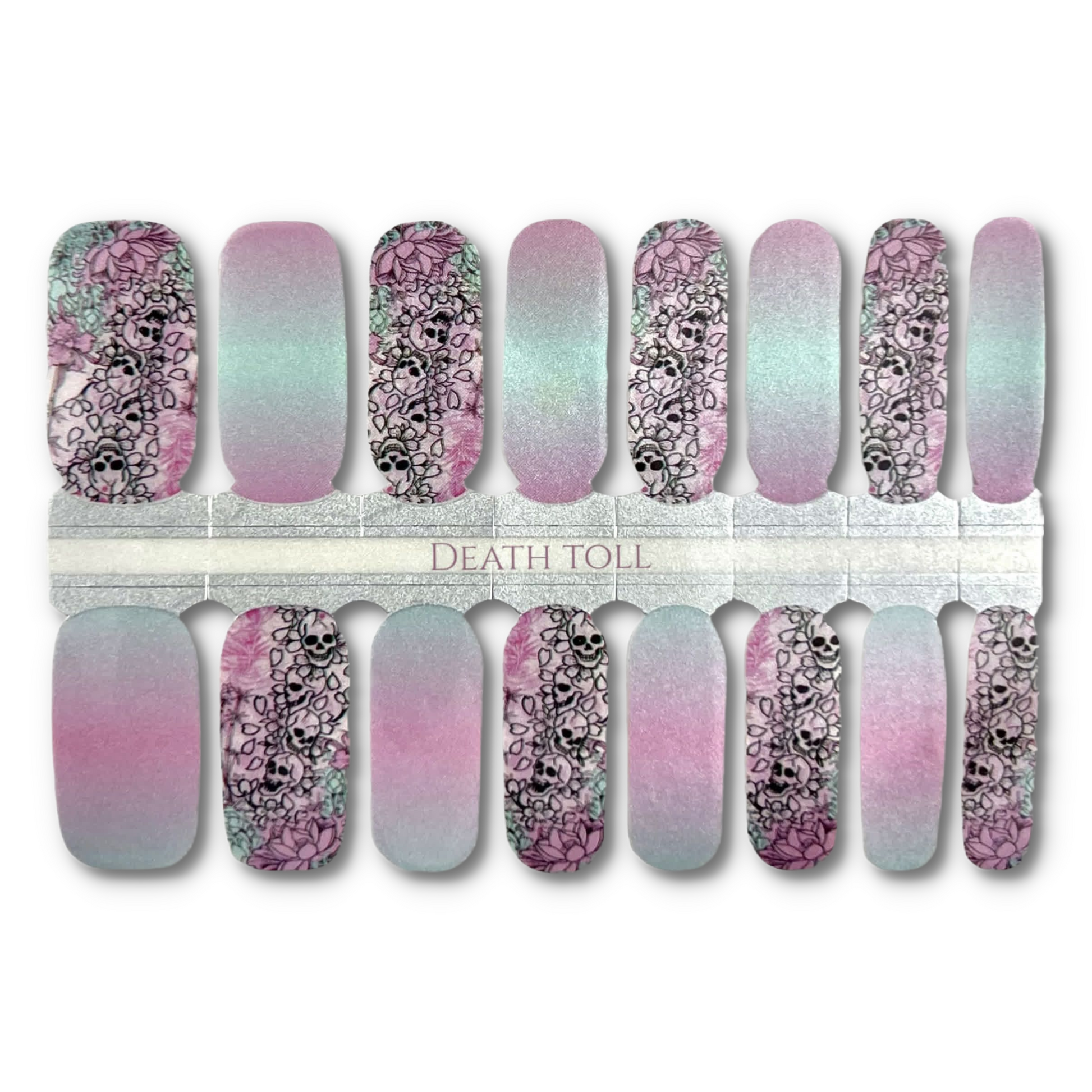 TURQUOISE AND PINK PEARL OMBRÉ WITH LOTUS AND SKULL DESIGN