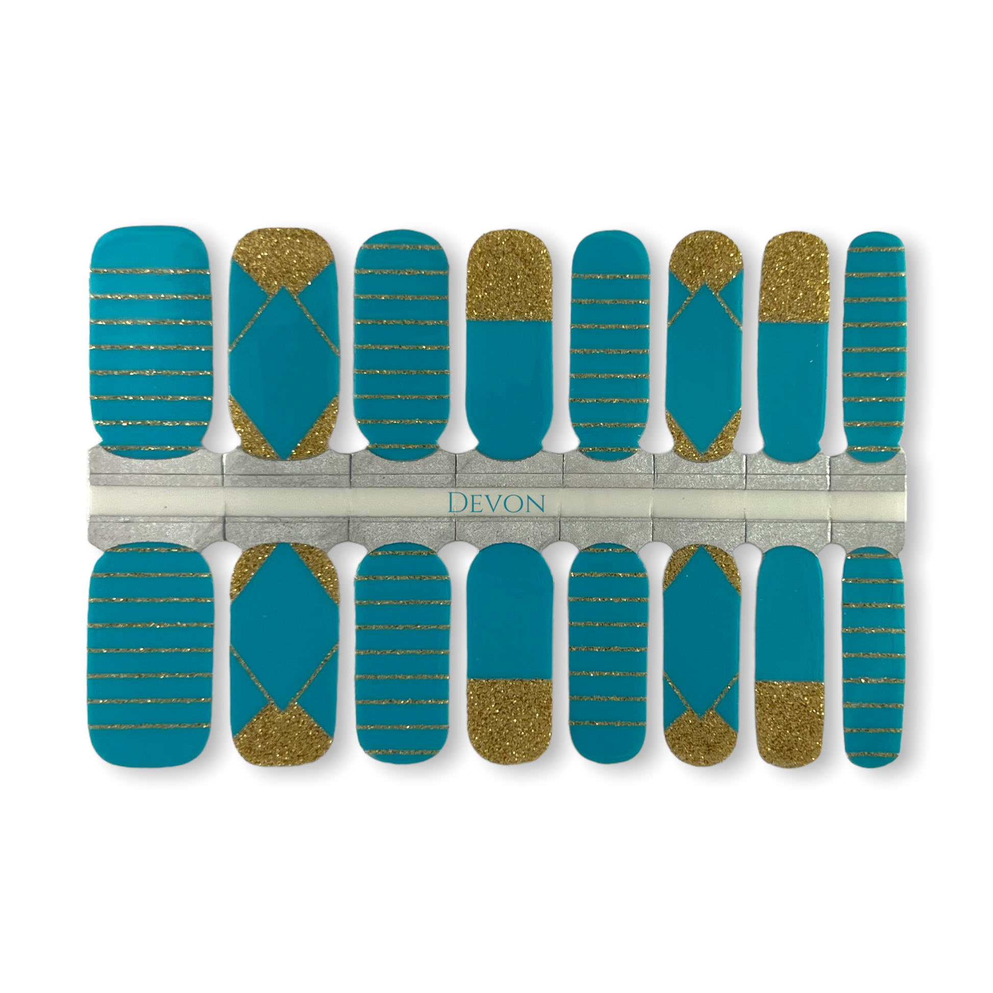 16 REAL NAIL POLISH STRIPS IN A VIBRANT TURQUOISE WITH GOLD GLITTER DESIGNS