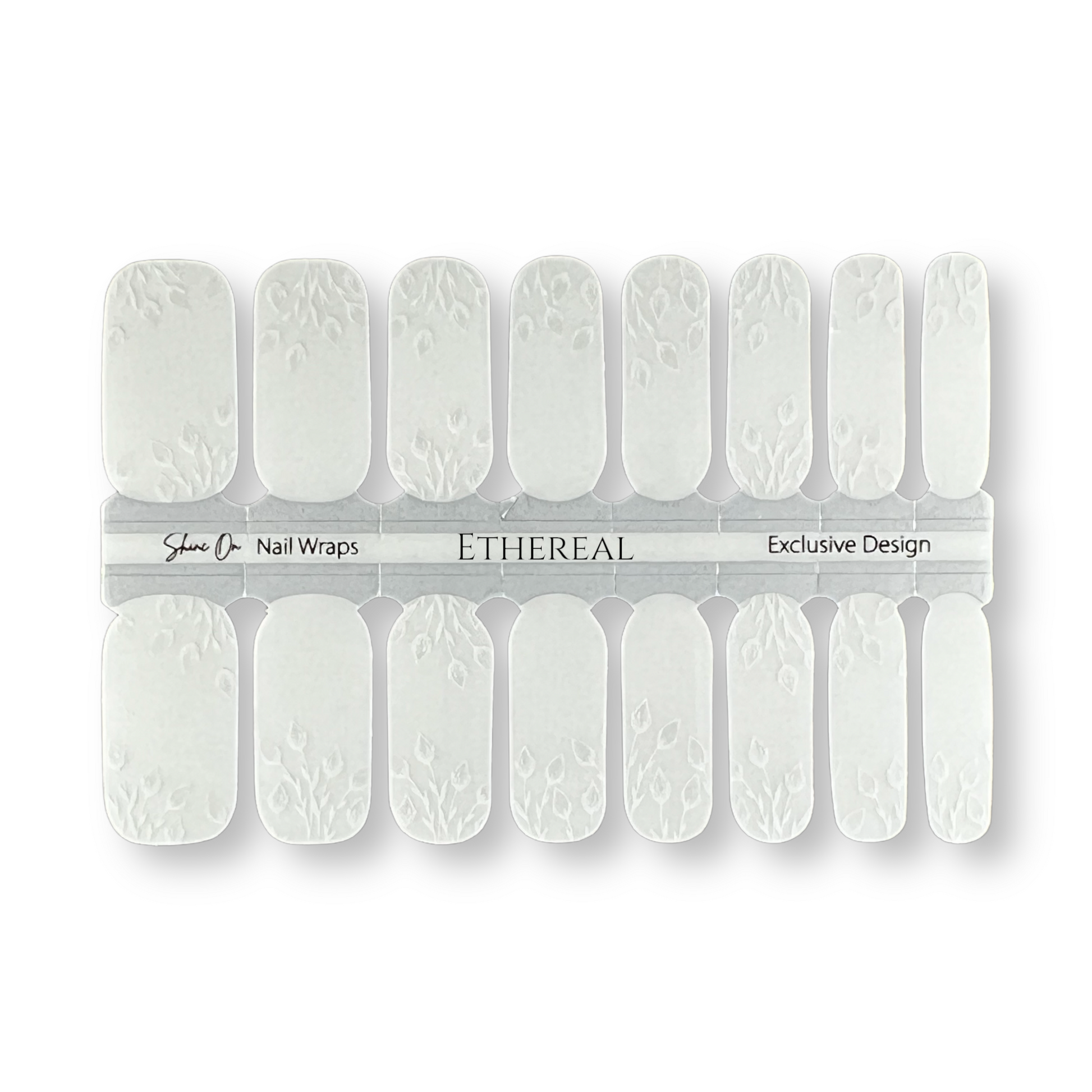 16 REAL NAIL POLISH STRIPS FEATURING A PEARLIZED WHITE BUD DESIGN ON CLEAR BASE