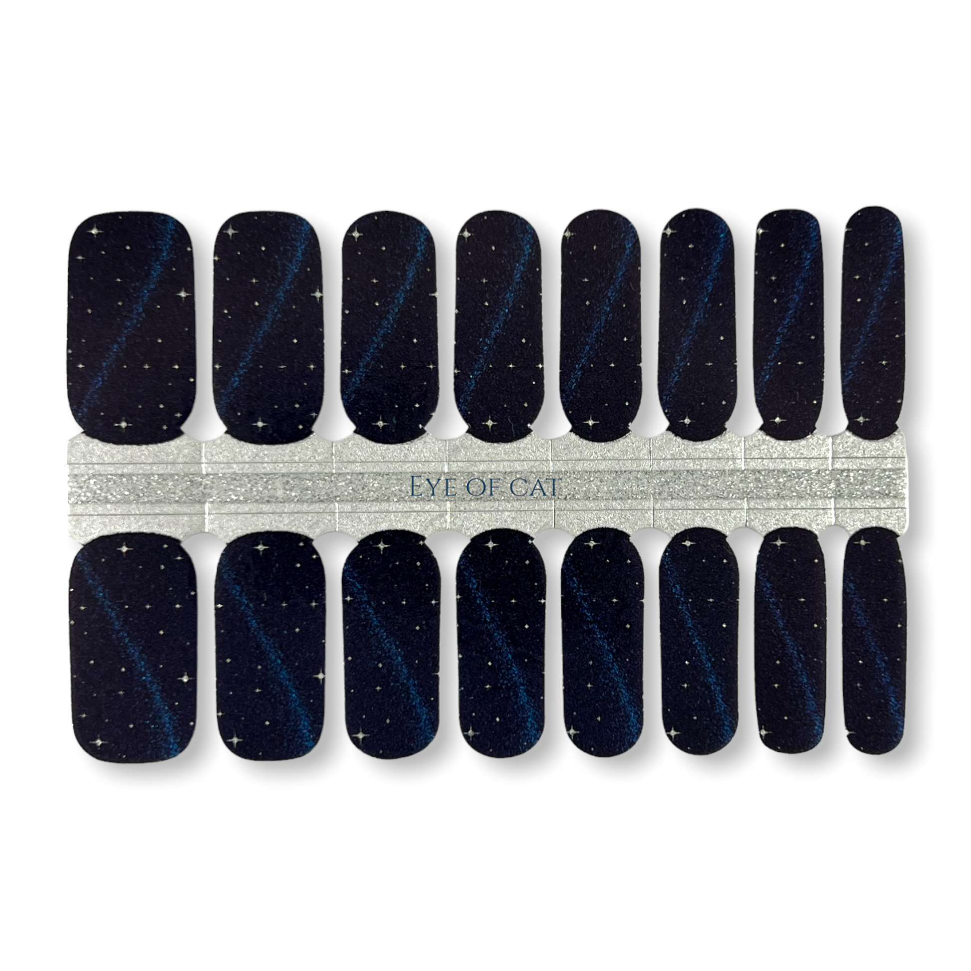 16 REAL NAIL POLISH STRIPS IN A DEEP DEEP DEEEEEEEP BLUE WITH DARK BLUE CATS EYE DETAILS AND A FINE GLITTER BASE FEATURING A FEW TINY STAR SHINE DETAILS