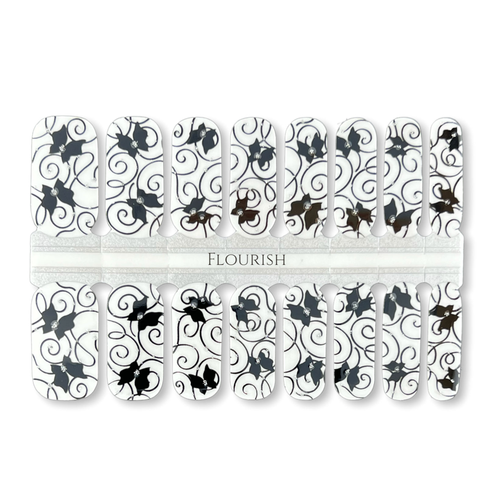 16 REAL NAIL POLISH STRIPS BLACK SCROLLY LINES AND BUTTERFLIES WITH SILVER GLITTER ACCENT ON A TRANSPARENT BASE
