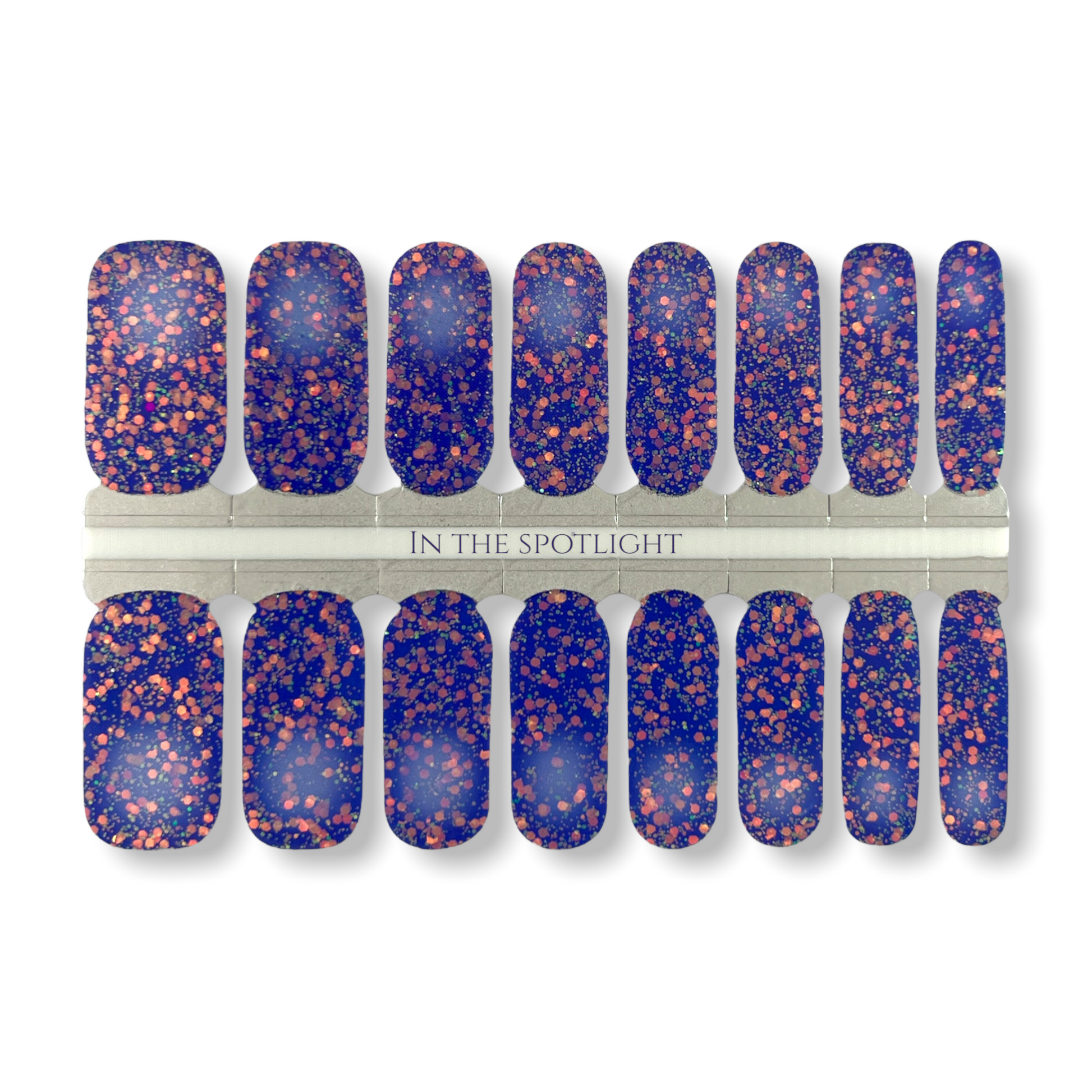 16 REAL NAIL POLISH STRIPS IN A BLUE CIRCULAR OMBRÉ WITH LOTS OF FINE AND CHUNKY COLOUR SHIFT GLITTER