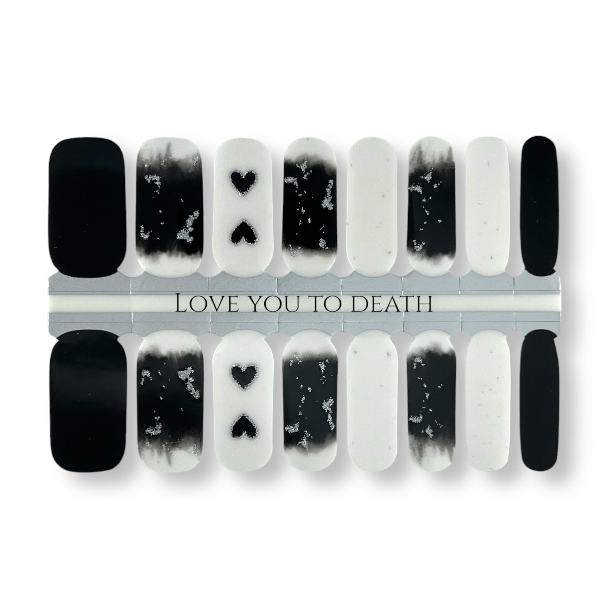 16 REAL NAIL POLISH STRIPS IN A SHEER WHITE AND SEMI SHEER BLACK MIXED MANI WITH SILVER GLITTER ACCENTS FEATURING A HEART ACCENT STRIP