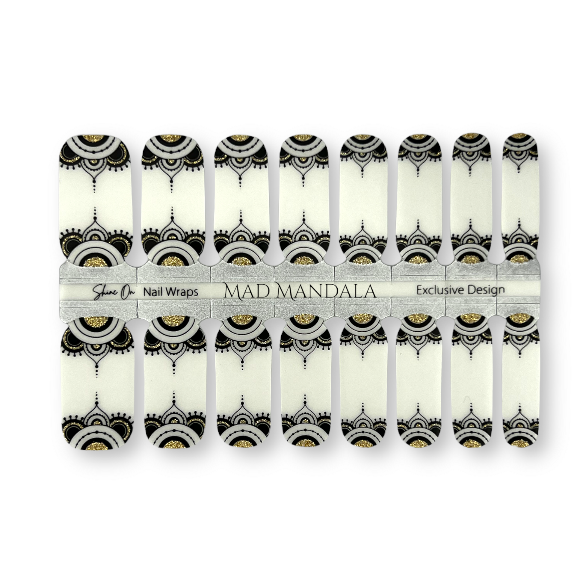 THIS SHINE ON EXCLUSIVE DESIGN FEATURES A BLACK MANDALA DESIGN STARTING AT THE CUTICLE WITH GOLD GLITTER ACCENTS ON A CLEAR BASE.