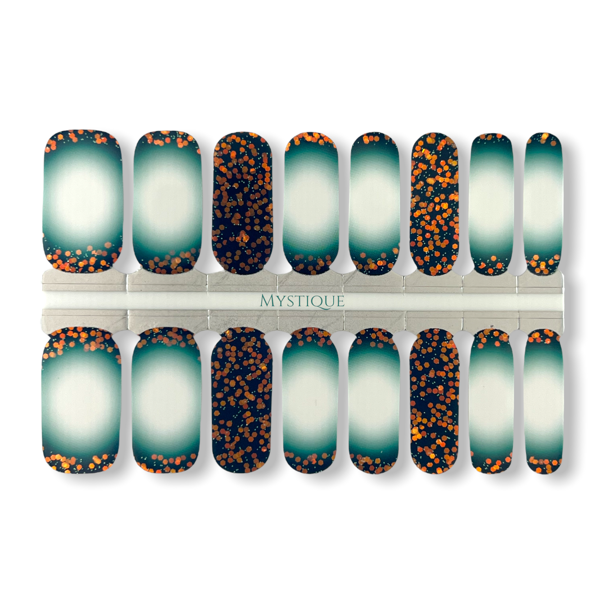 16 REAL NAIL POLISH STRIPS IN EMERALD TO WHITE OMBRÉ WITH FINE AND CHUNKY HOLOGRAPHIC GLITTER AT THE CUTICLE AND SOLID EMERALD ACCENT STRIPS COVERED IN FINE AND CHUNKY HOLOGRAPHIC GLITTER