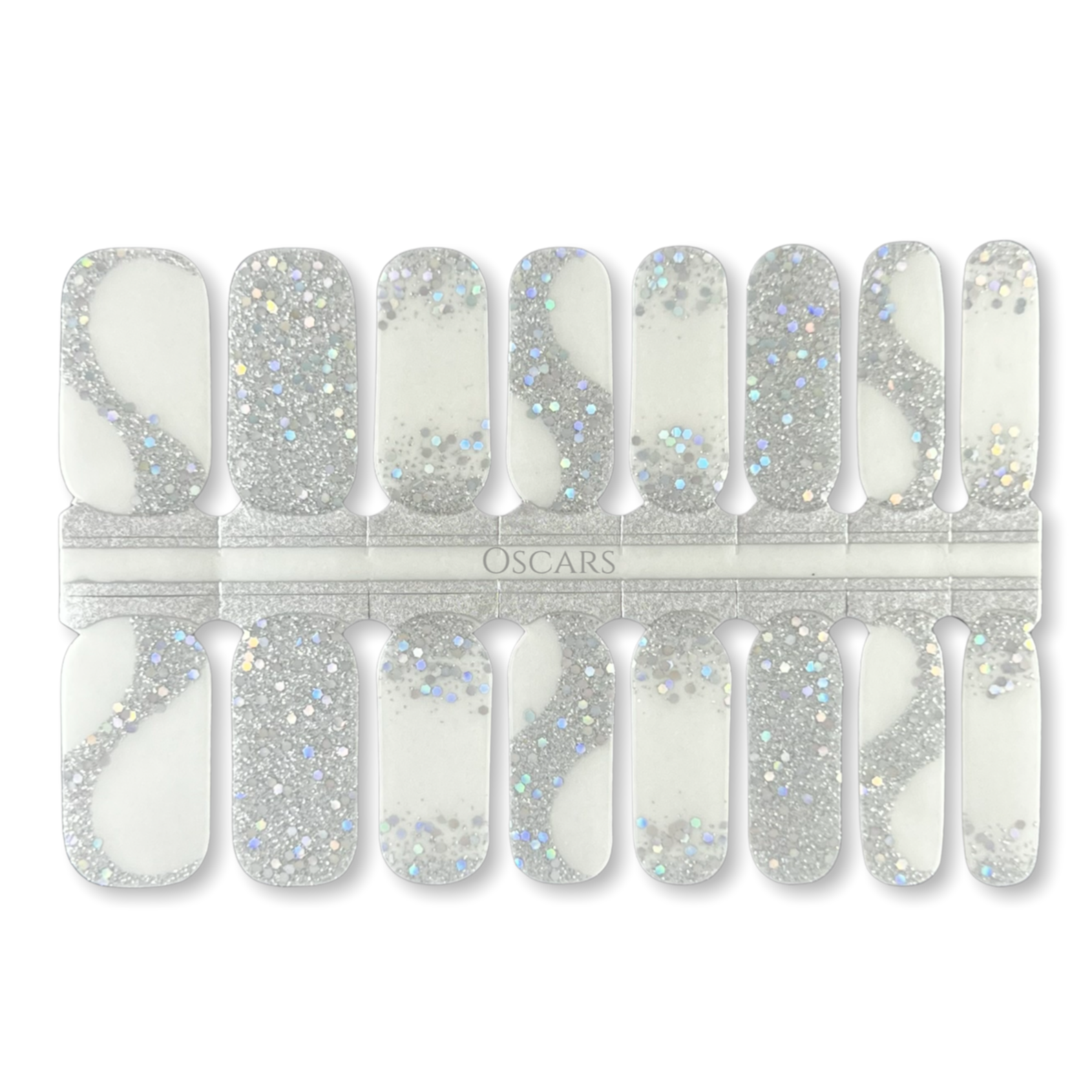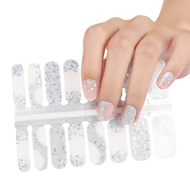 16 REAL NAIL POLISH STRIPS TRANSPARENT BASE WITH A MIX OF GLITZY SILVER GLITTER S DESIGN, CUTICLE DESIGN, AND SOLID ALL COMPLIMENTED WITH CHUNKY HOLO GLITTER.