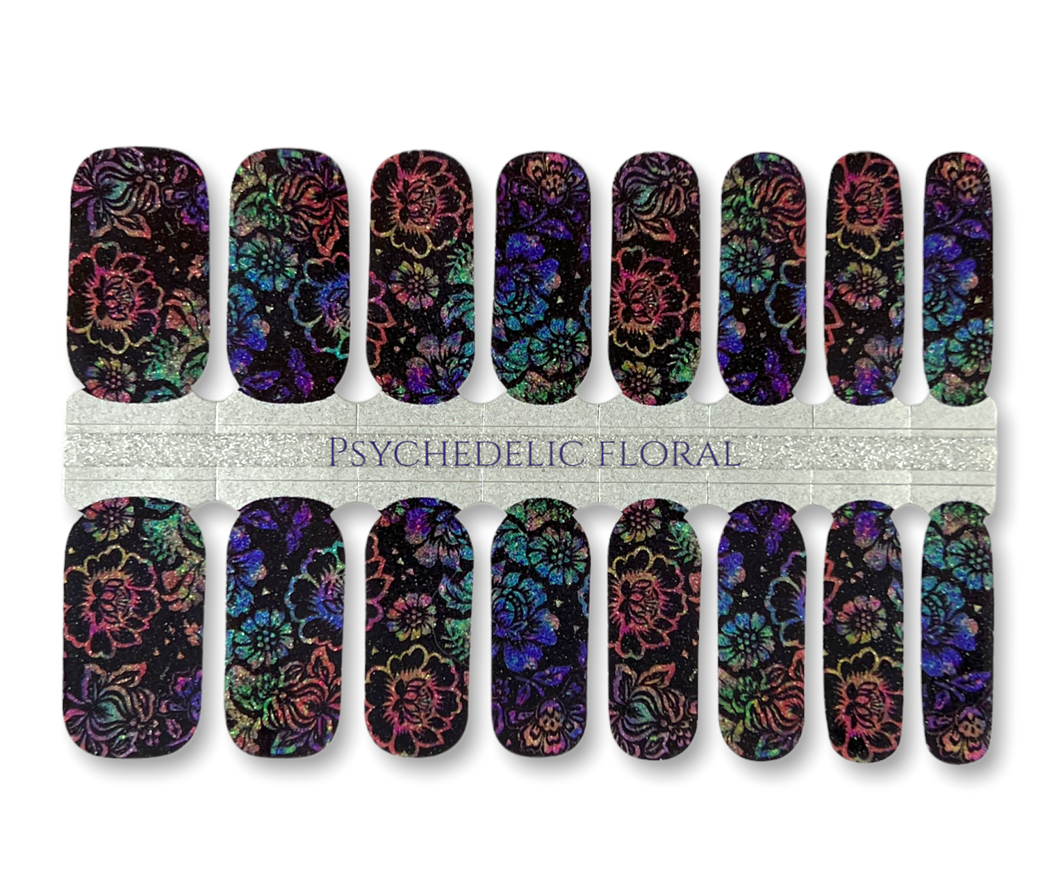 16 REAL NAIL POLISH STRIPS IN BLACK WITH MULTI COLOUR OMBRÉ GLITTER FLORAL DESIGN