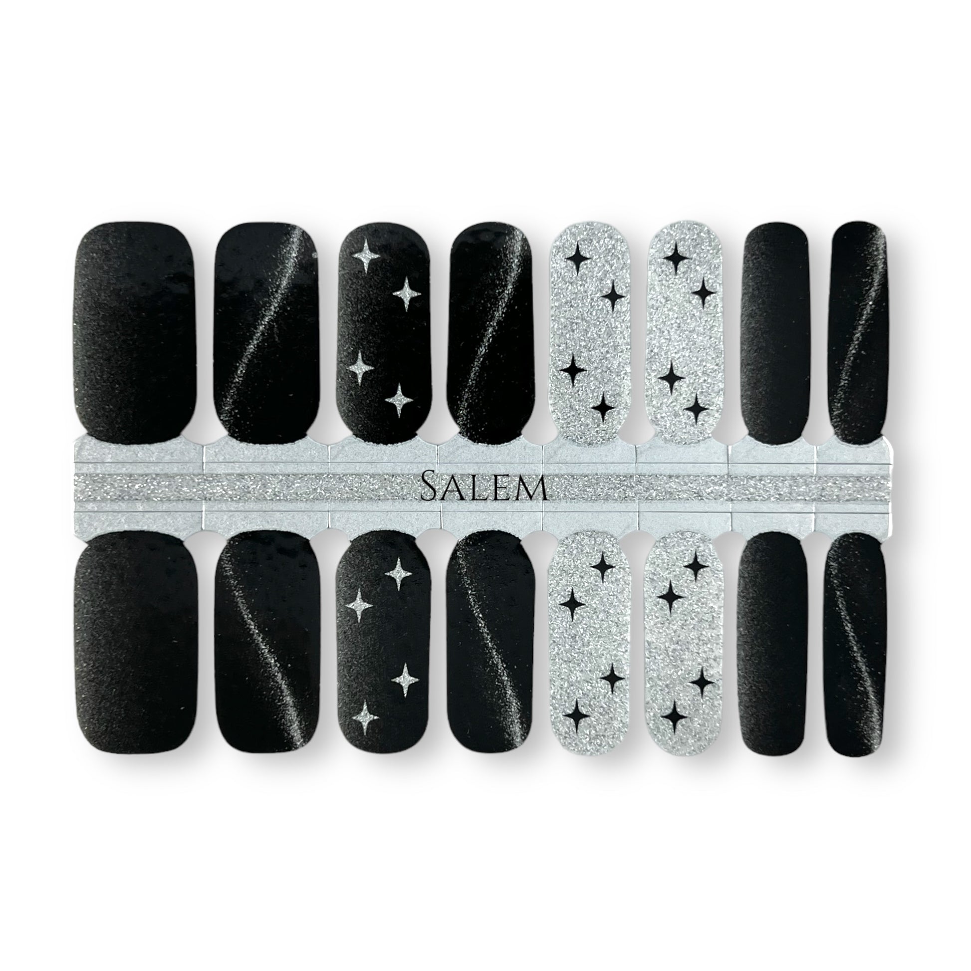 16 REAL NAIL POLISH STRIPS IN BLACK AND SILVER GLITTER DESIGN FEATURING CATS EYE DESIGN AND VERTICAL OMBRÉ
