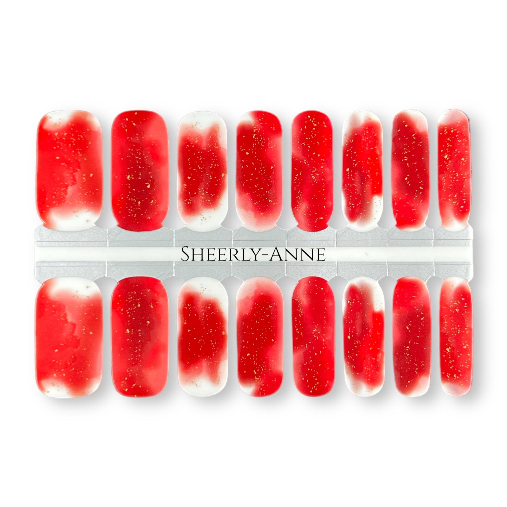 A SHEER DESIGN WITH RED TONES AND GOLD FOIL FLECKS