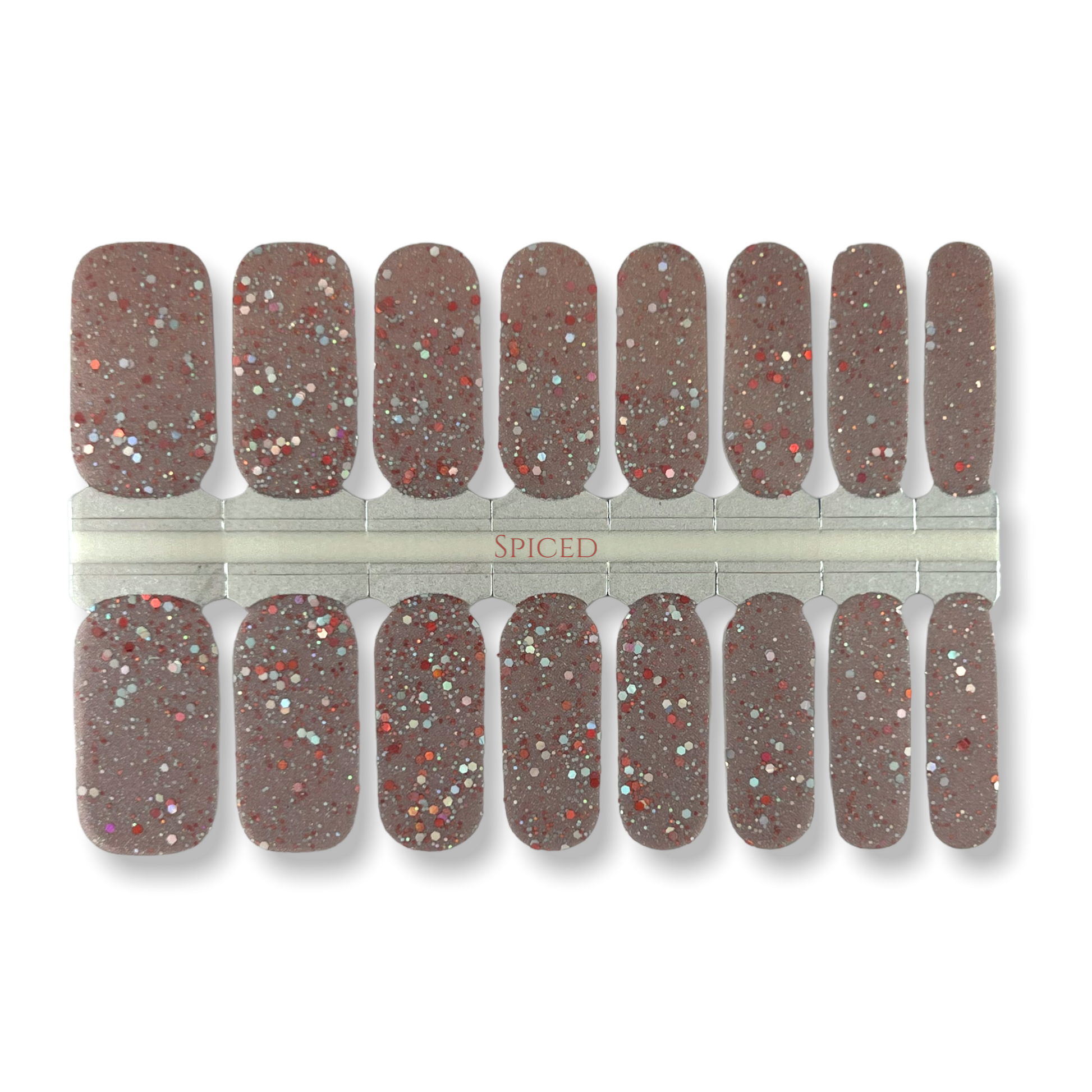 16 REAL NAIL POLISH STRIPS IN A LIGHT ROSE PEARL BASE TOPPED WITH SPICED TONES COLOUR SHIFT GLITTER AND HOLOGRAPHIC GLITTER