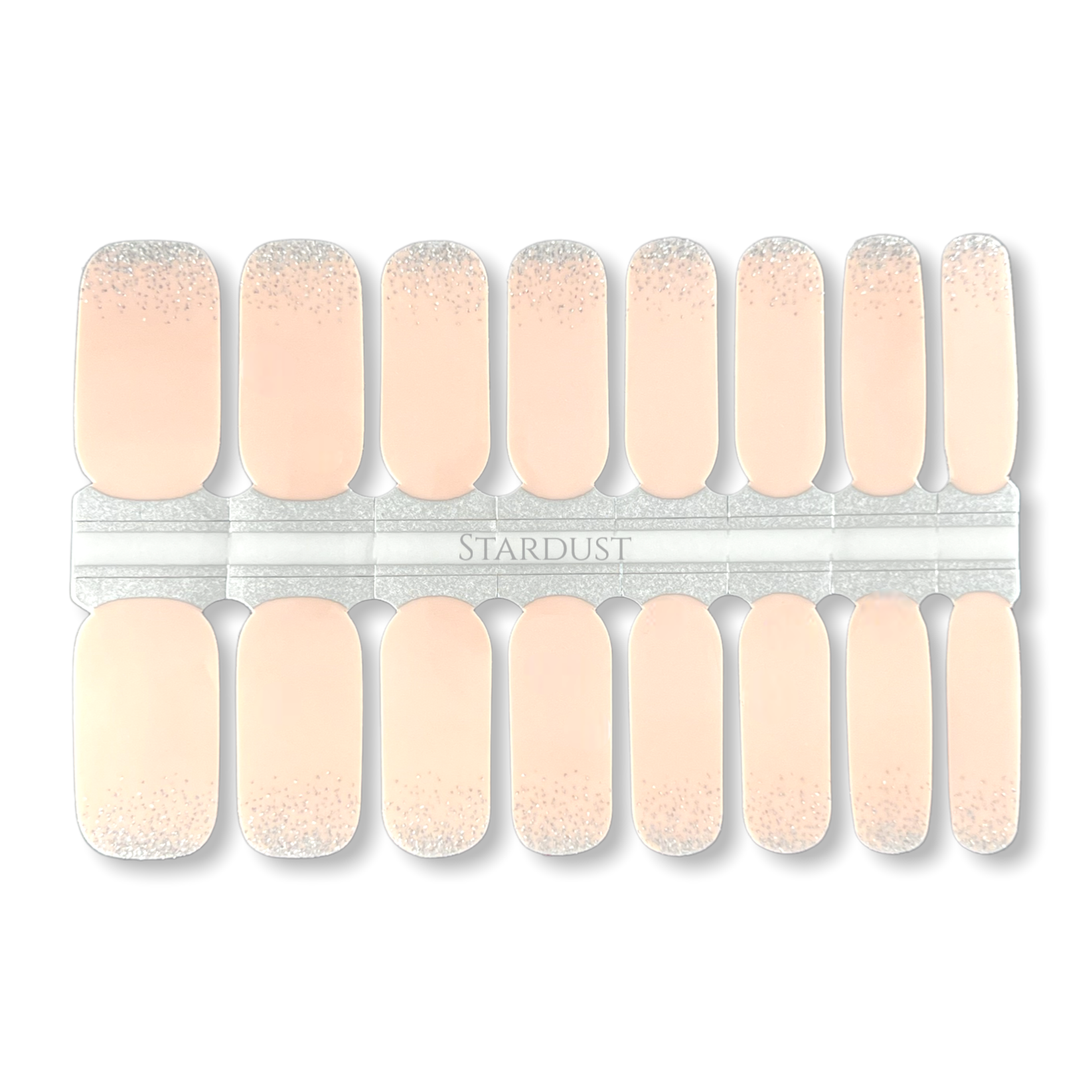16 REAL NAIL POLISH STRIPS IN A SOFT PEACH WITH FINE SILVER GLITTER AT THE CUTICLES
