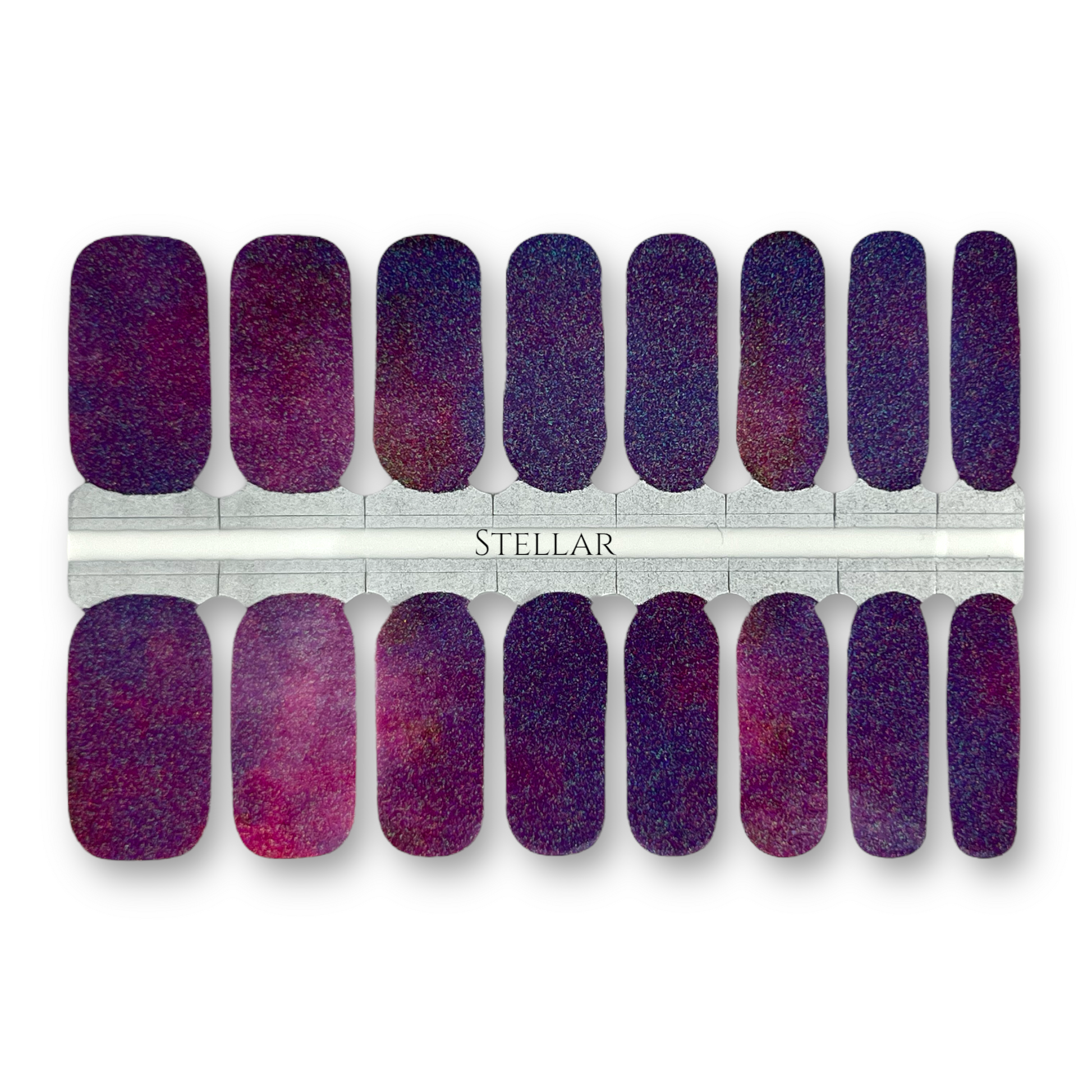 16 REAL NAIL POLISH STRIPS IN A MIXED PURPLE AND PINK DESIGN FEATURING A RAINBOW HOLOGRAPHIC EXTRA FINE GLITTER