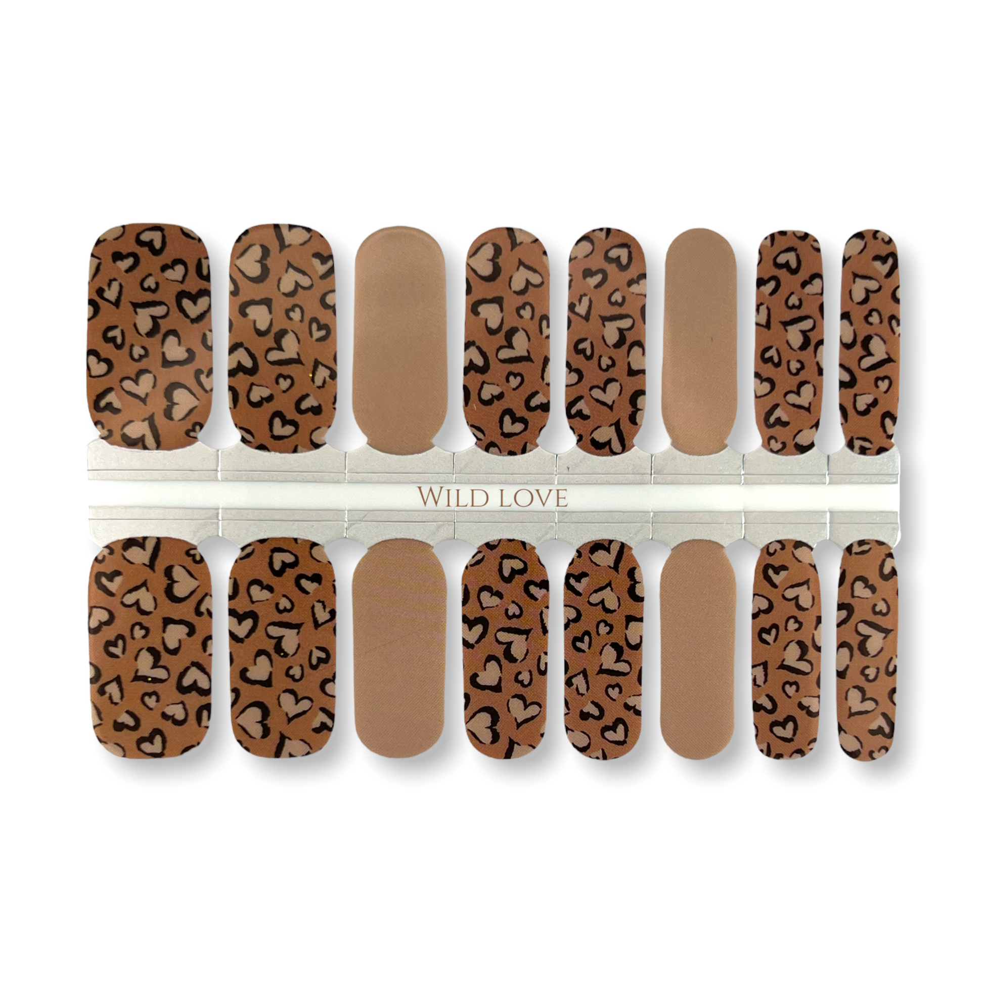 16 REAL NAIL POLISH STRIPS IN BROWN TONES FEATURING A HEART SHAPED CHEETAH DESIGN IN A CREAM FINISH