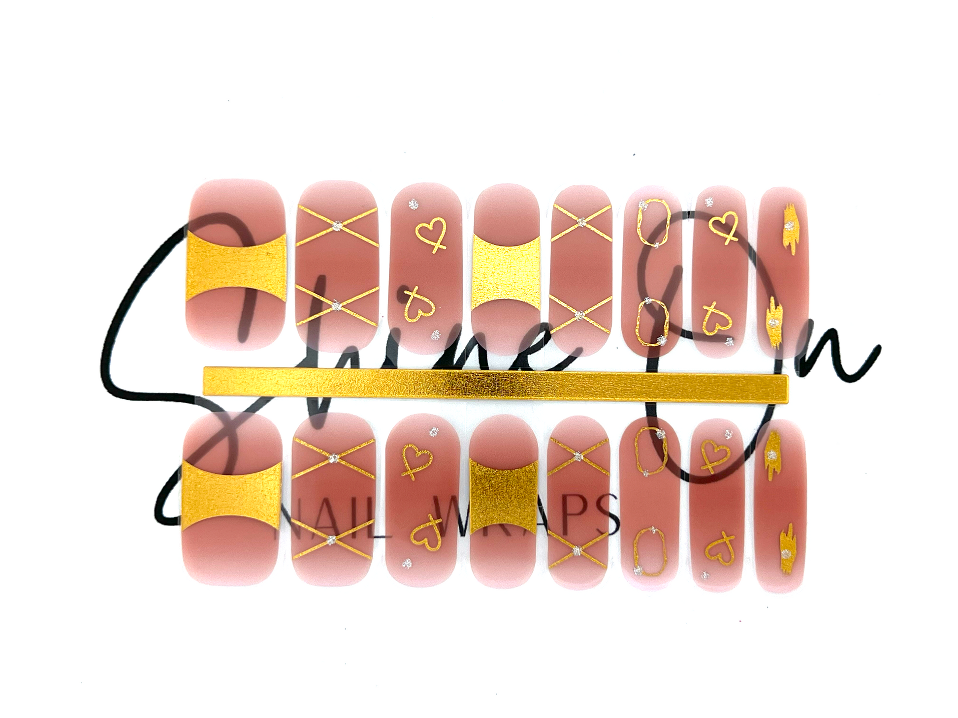 16 SEMI-CURED UV GEL WRAPS IN A NUDE SHEER WITH VARIED GOLD FOIL DESIGNS FEATURING SILVER GLITTER ACCENTS