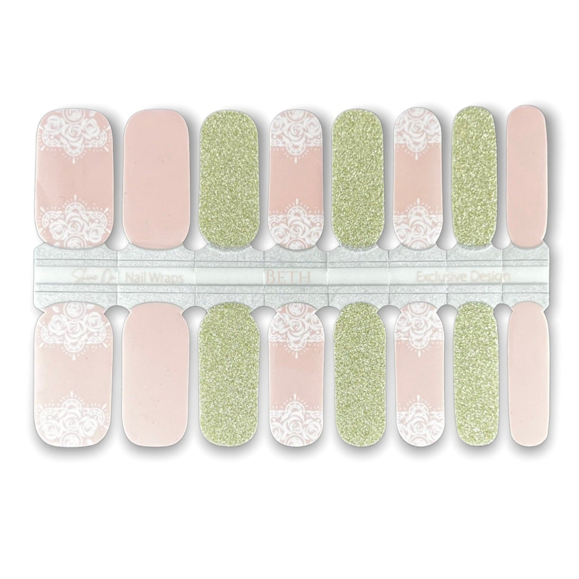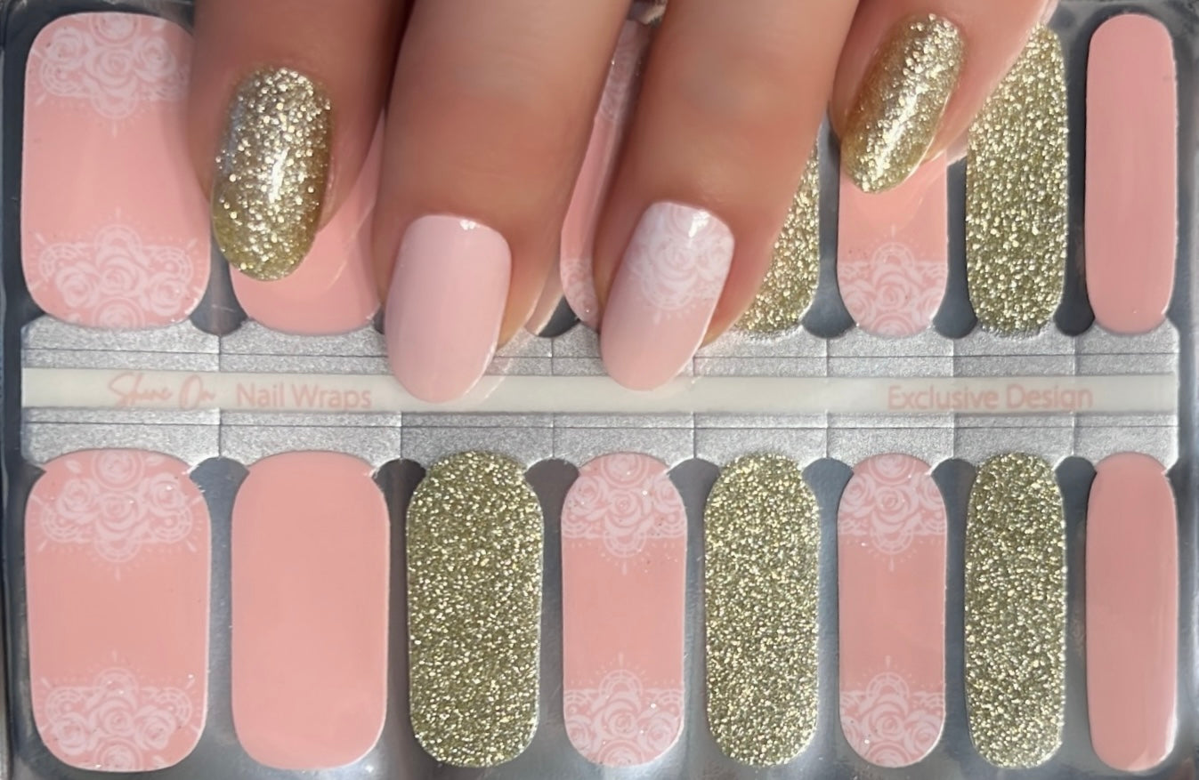 16 REAL NAIL POLISH STRIPS A SOFT PINK WITH A DELICATE LACE DETAIL AT THE CUTICLE COMPLIMENTED WITH GOLD ACCENT NAILS