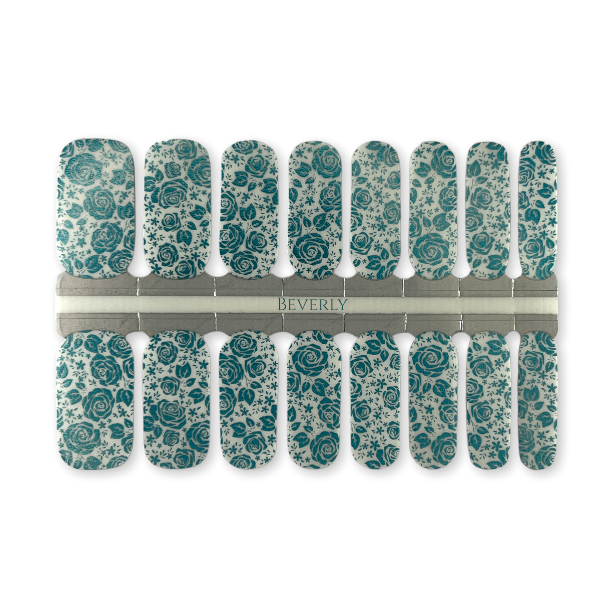 FEATURING A METALLIC TURQUOISE FLORAL DESIGN ON A CLEAR BASE