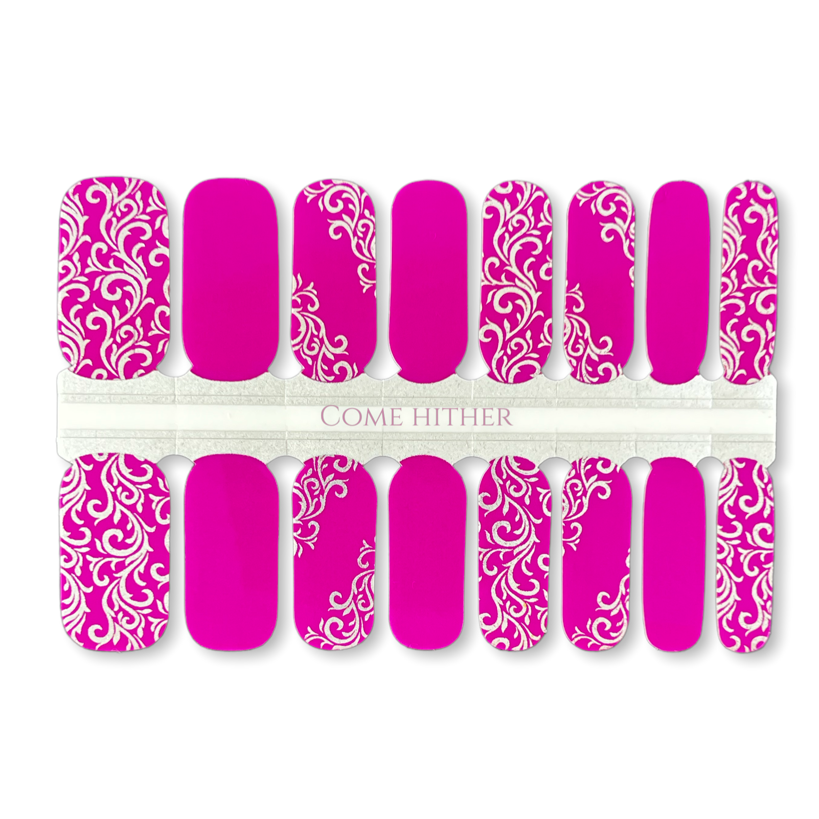 16 REAL NAIL POLISH STRIPS IN A COMMANDING FUCHSIA WITH A SILVER FOIL SCOLL DESIGN