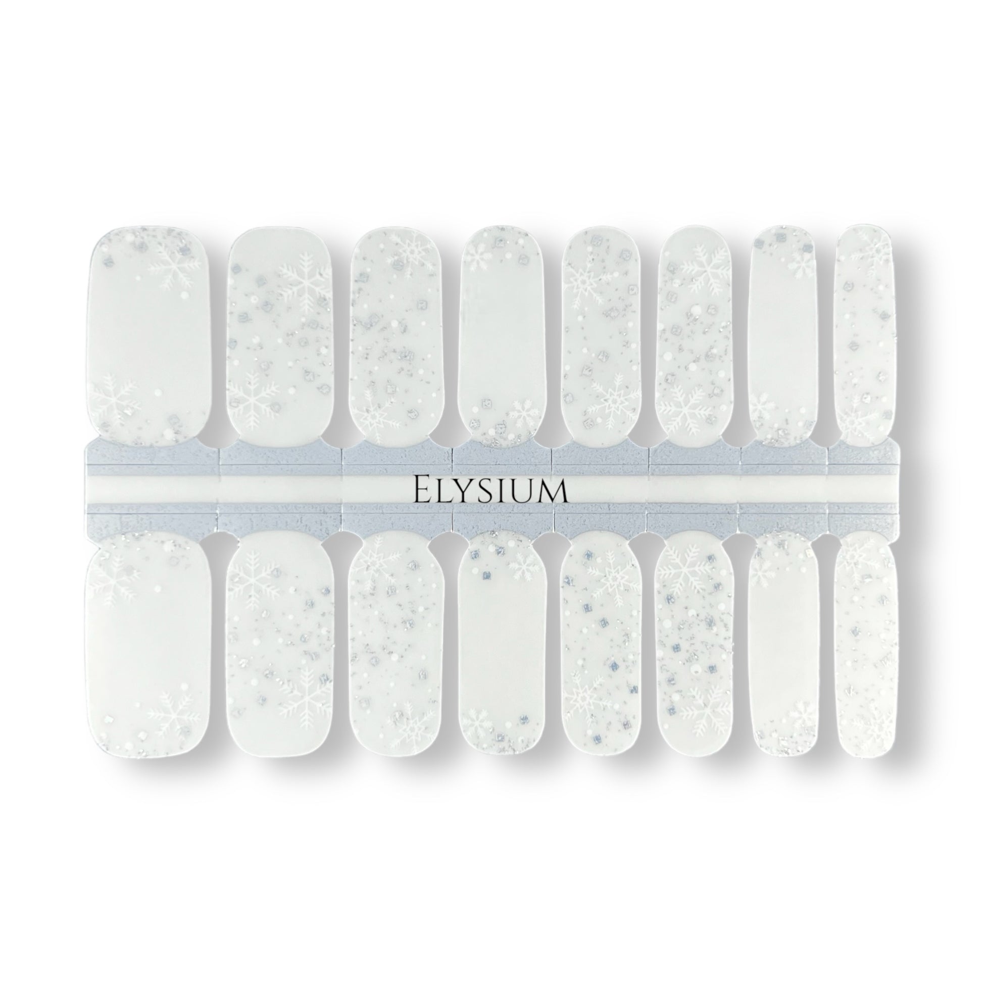 16 REAL NAIL POLISH STRIPS FEATURING A SNOWFLAKE DESIGN WITH TINY HOLOGRAPHIC GLITTER AND HOLOGRAPHIC SQUARES ON A CLEAR BASE