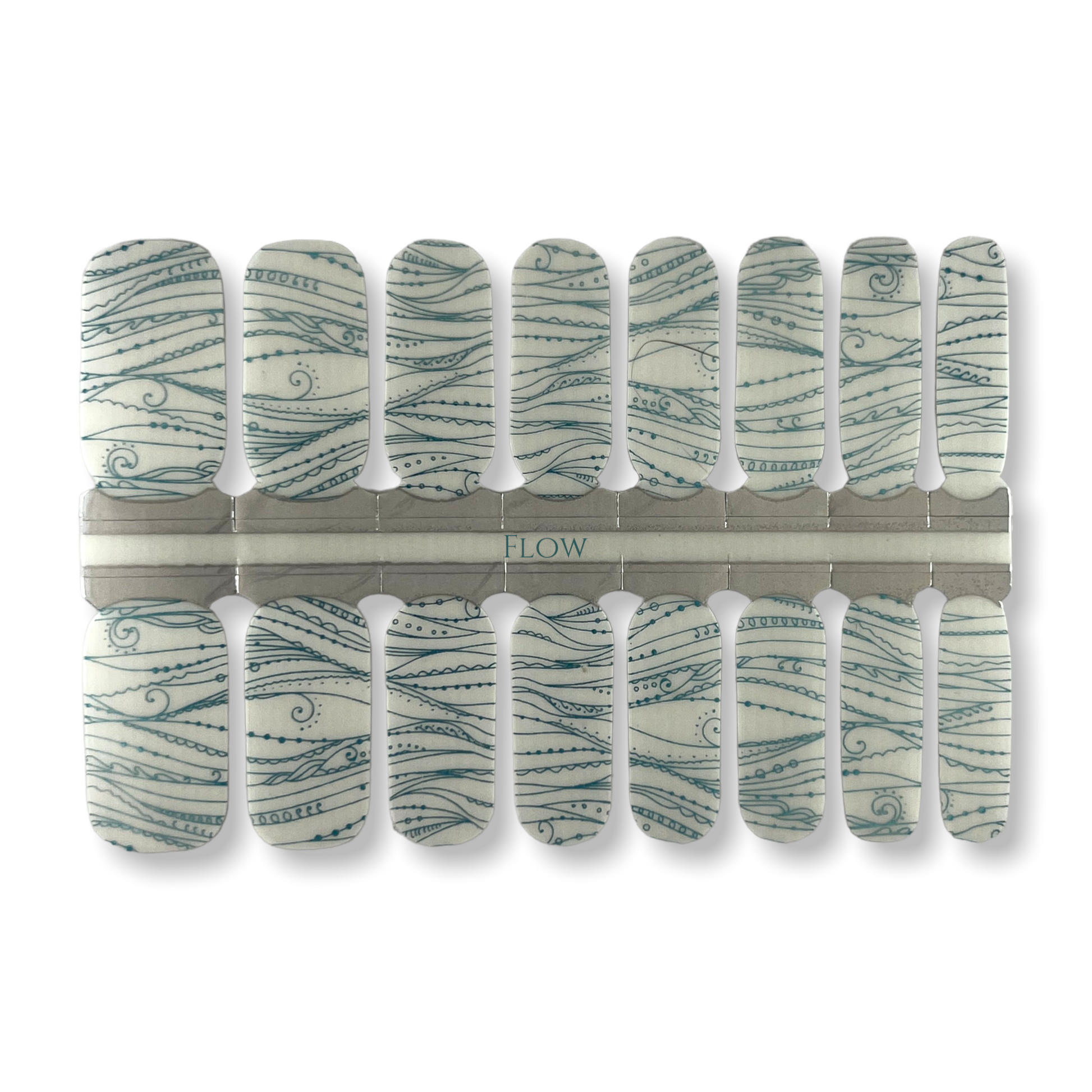 16 REAL NAIL POLISH STRIPS IN A METALLIC TEAL FLOWING LINE DESIGN ON A CLEAR BASE