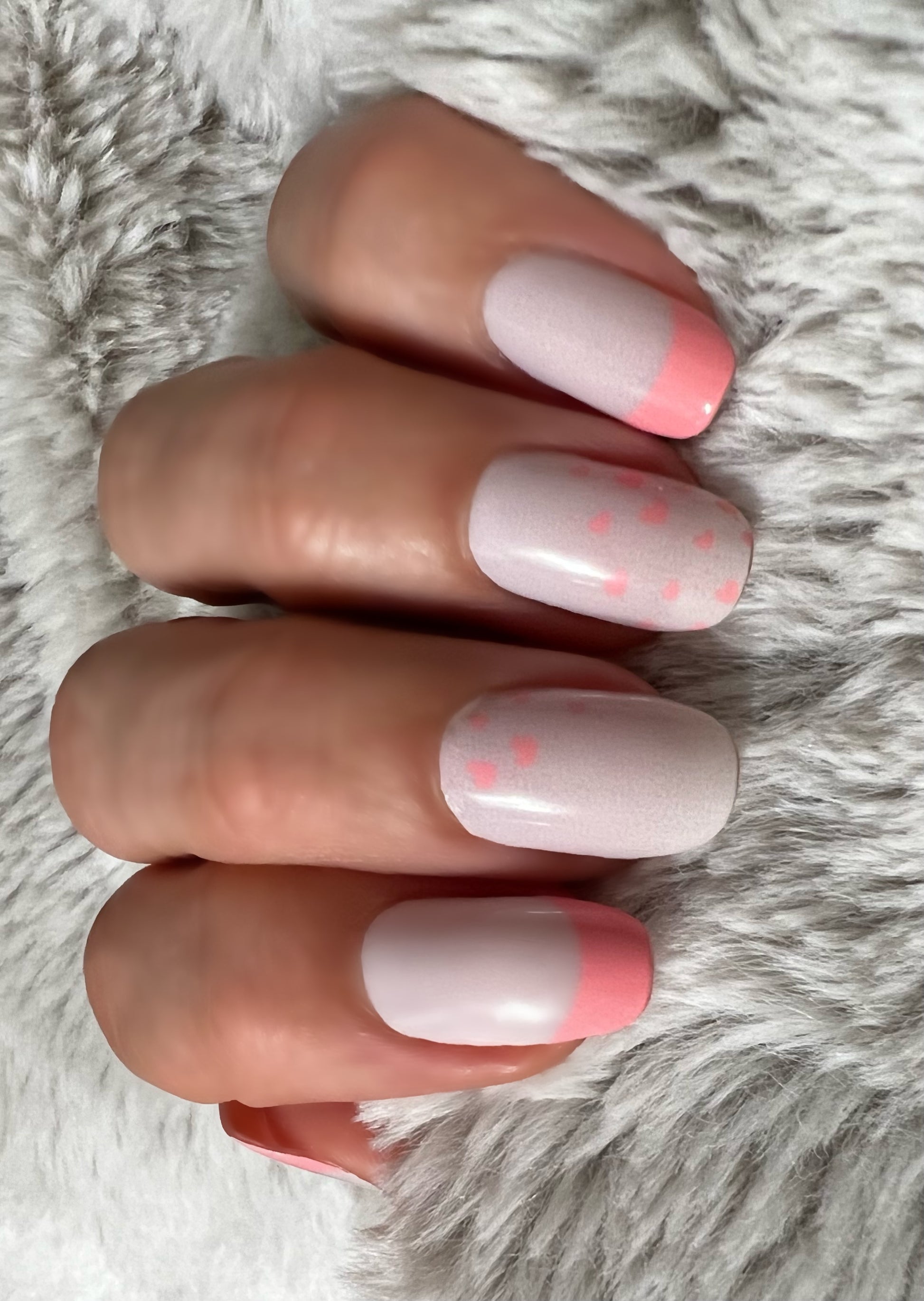 LIGHT CORAL TIPS ON SEMI TRANSPARENT CREAM PINK BASE WITH TINY HEARTS ACCENT NAILS