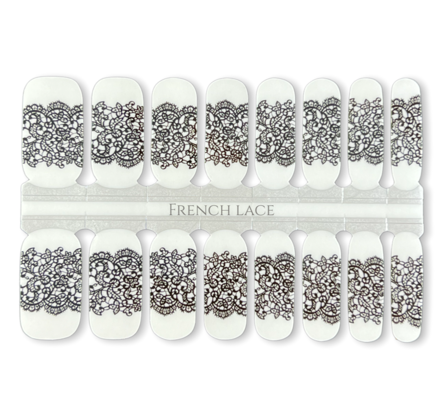 16 REAL NAIL POLISH STRIPS FEATURING A BLACK LACE TIP DESIGN OVER A TRANSPARENT BASE