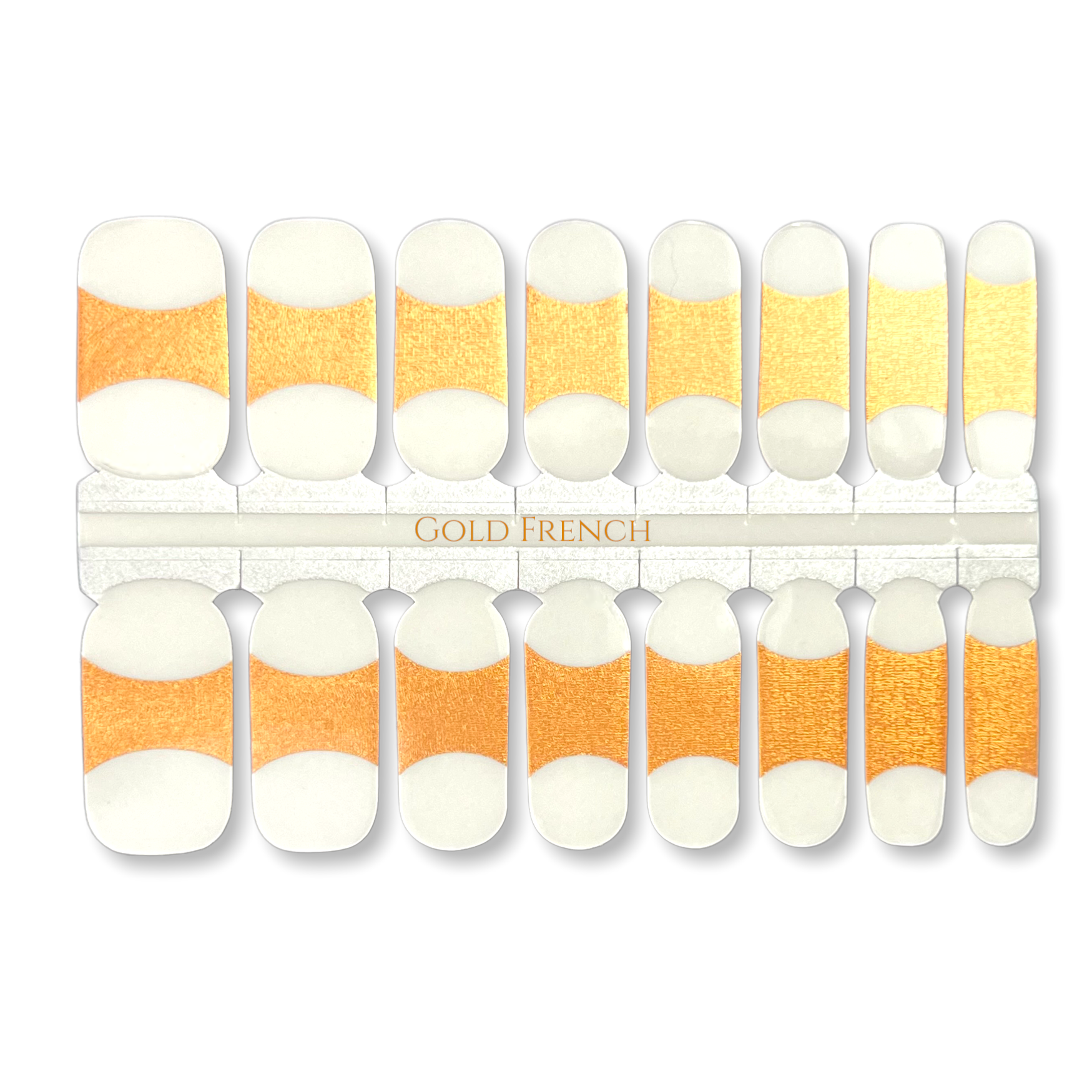16 REAL NAIL POLISH STRIPS IN A GOLD TIPPED FRENCH ON TRANSPARENT BASE.