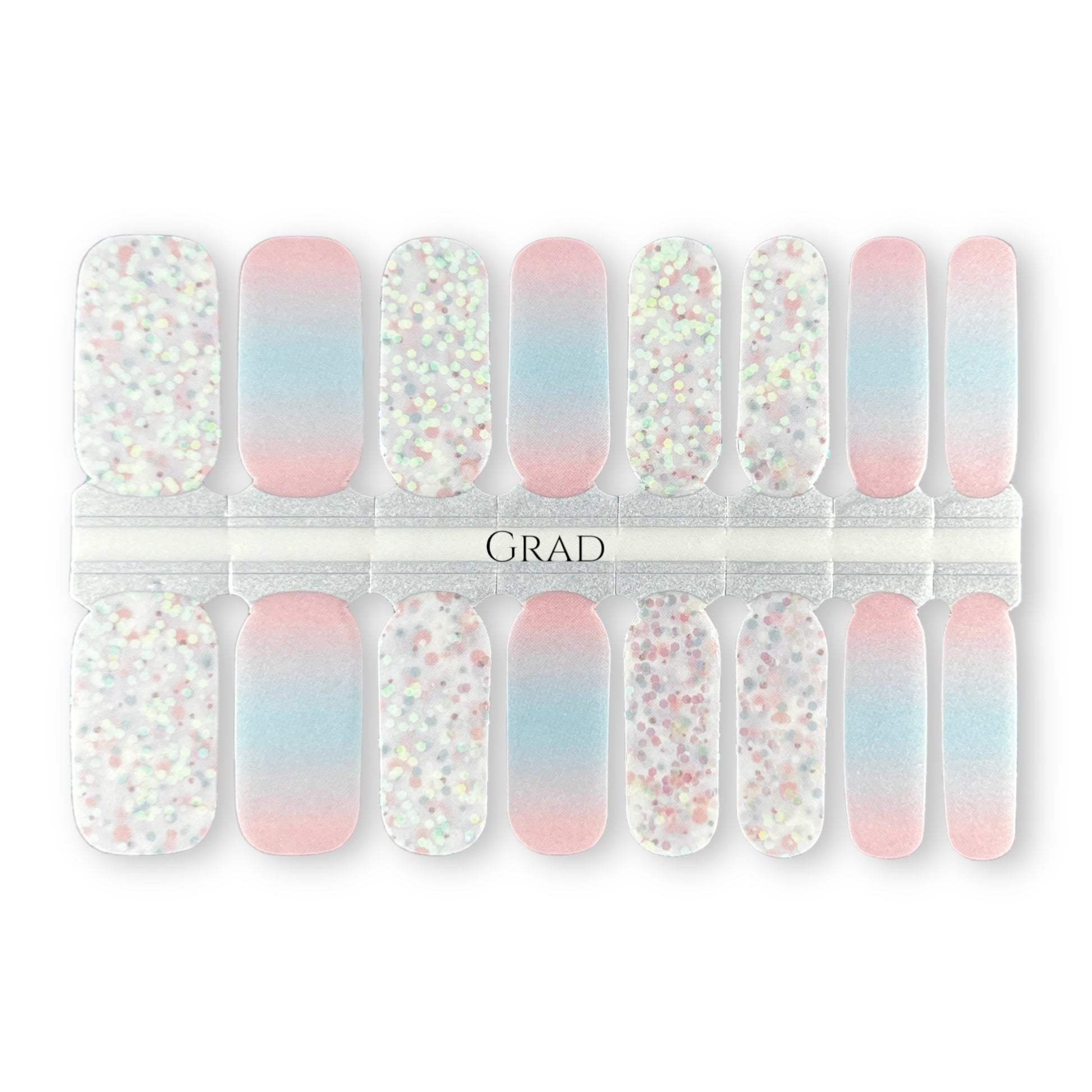 THIS MIXED MANI FEATURES A PEARL FINISH WITH ALTERNATING PINK BLUE OMBRÉ STRIPS AND WITH PEARL WITH HOLOGRAPHIC GLITTER STRIPS