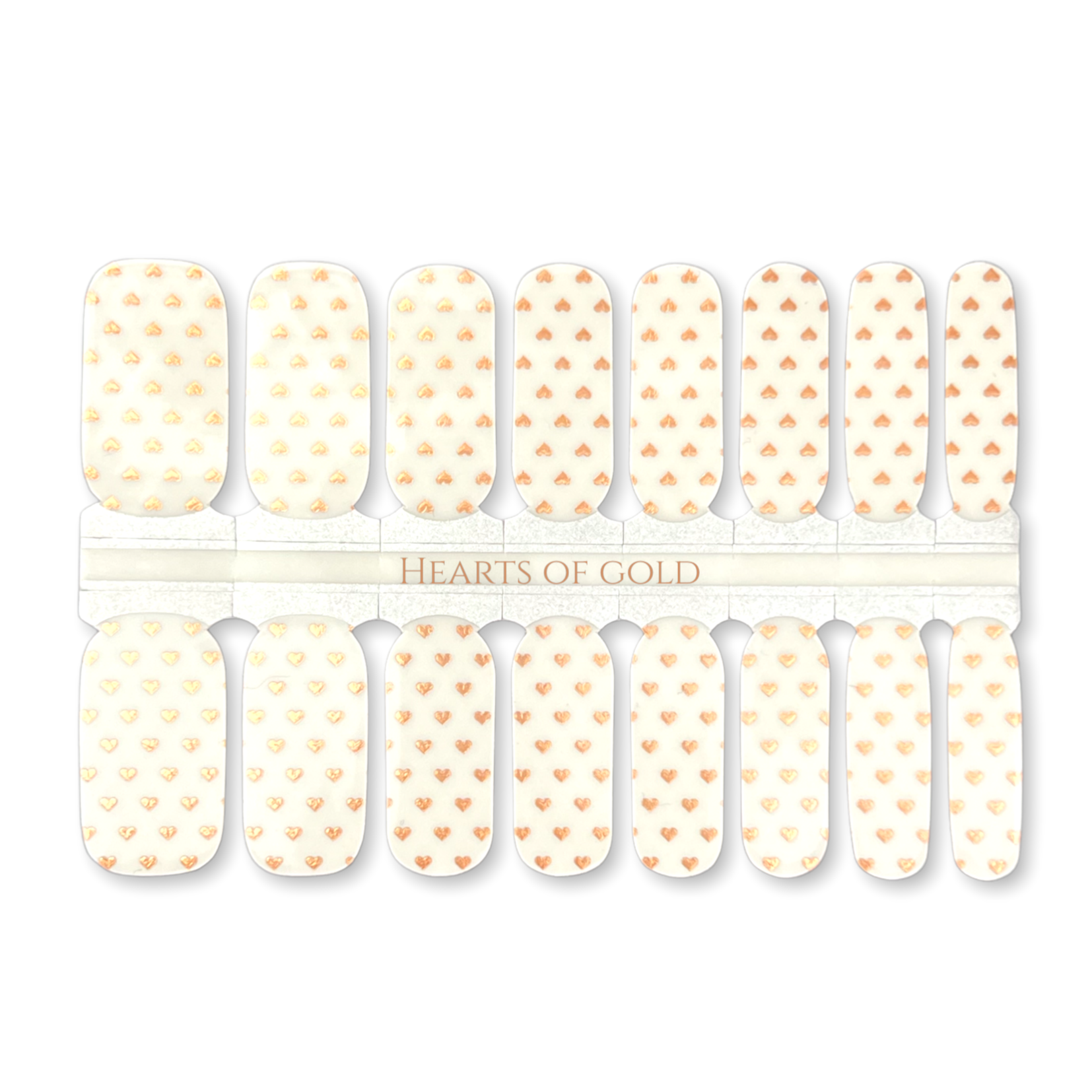 16 REAL NAIL POLISH STRIPS FEATURING A ROSE GOLD HEART PATTERN OVER A CLEAR BASE