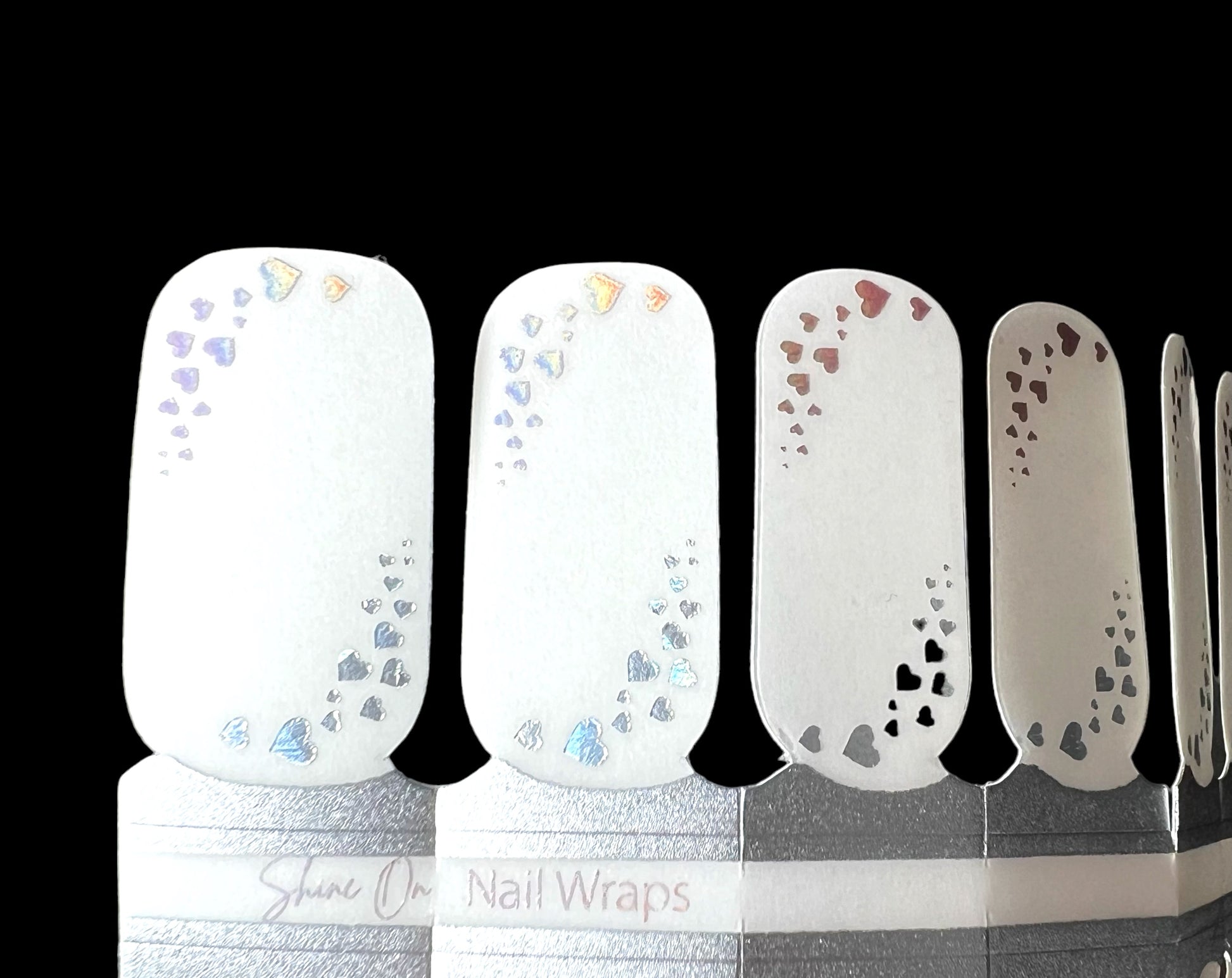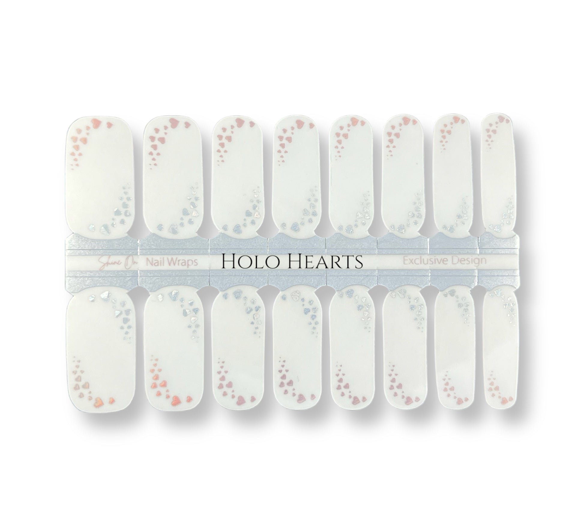 16 REAL NAIL POLISH STRIPS FEATURING ROSE HOLOGRAPHIC HEARTS ON ONE END AND CLASSIC HOLOGRAPHIC HEARTS ON THE OPPOSITE END