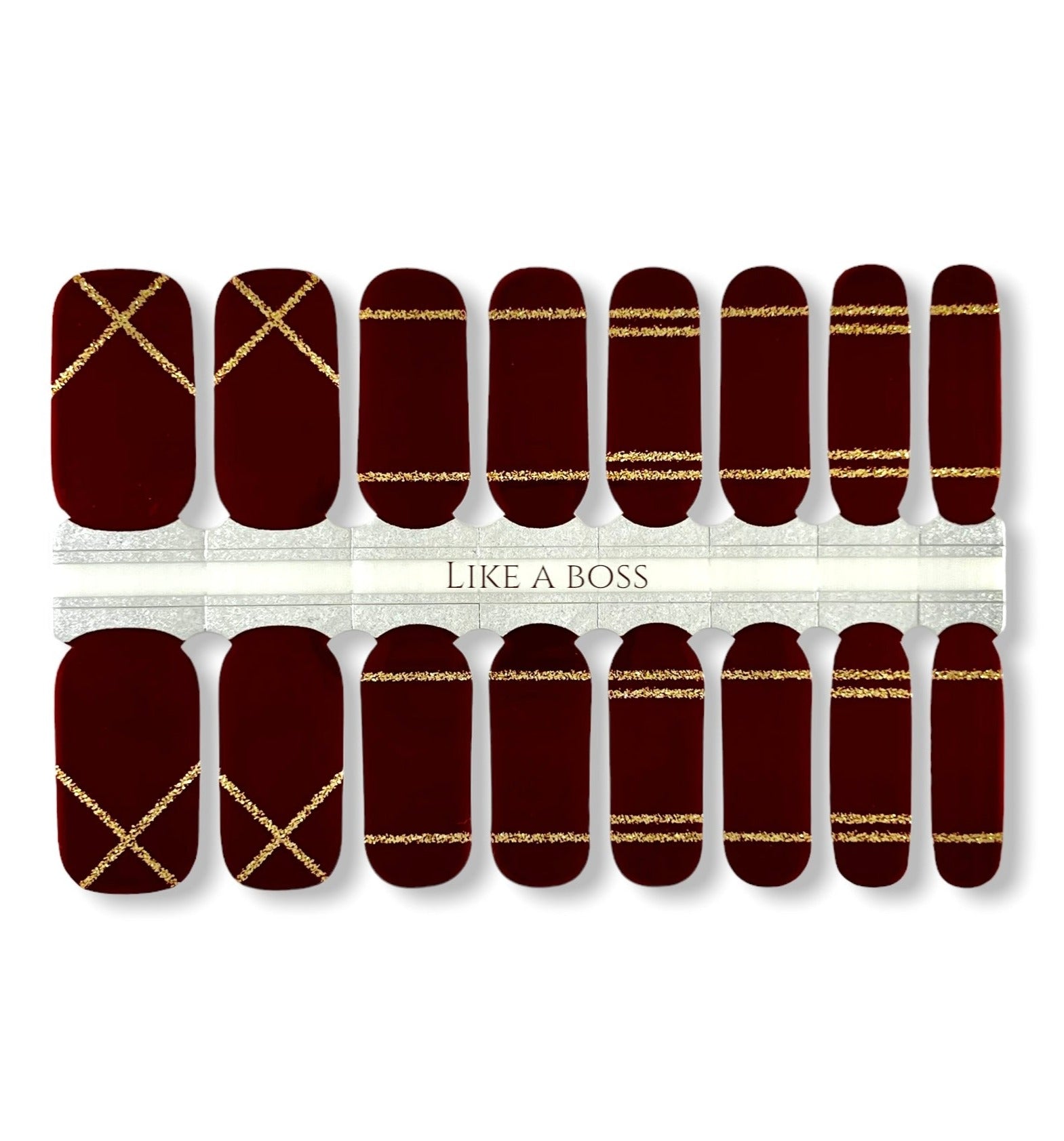 16 REAL NAIL POLISH STRIPS IN A STRONG DEEP WINE COLOR WITH GOLD GLITTER ACCENT LINES