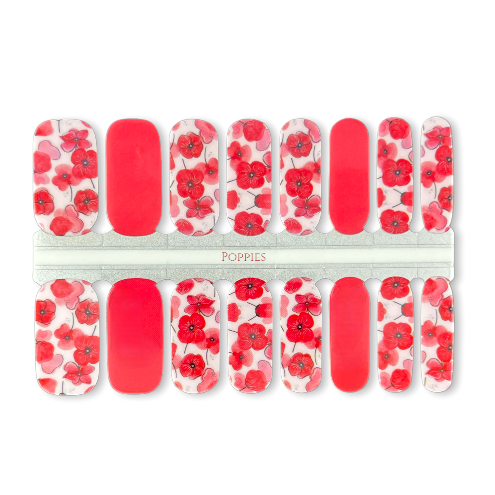 16 REAL NAIL POLISH STRIPS FEATURING A SOFT RED POPPY DESIGN WITH WHITE BASE AND SOFT RED SOLID ACCENT STRIPS