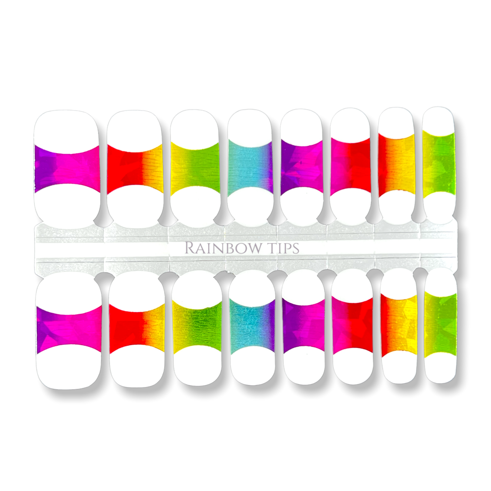 16 REAL NAIL POLISH STRIPS THIS FUN DESIGN FEATURES METALLIC VERTICAL OMBRÉ TIPS IN ALL THE COLORS OF THE RAINBOW, OVER A TRANSPARENT BASE.