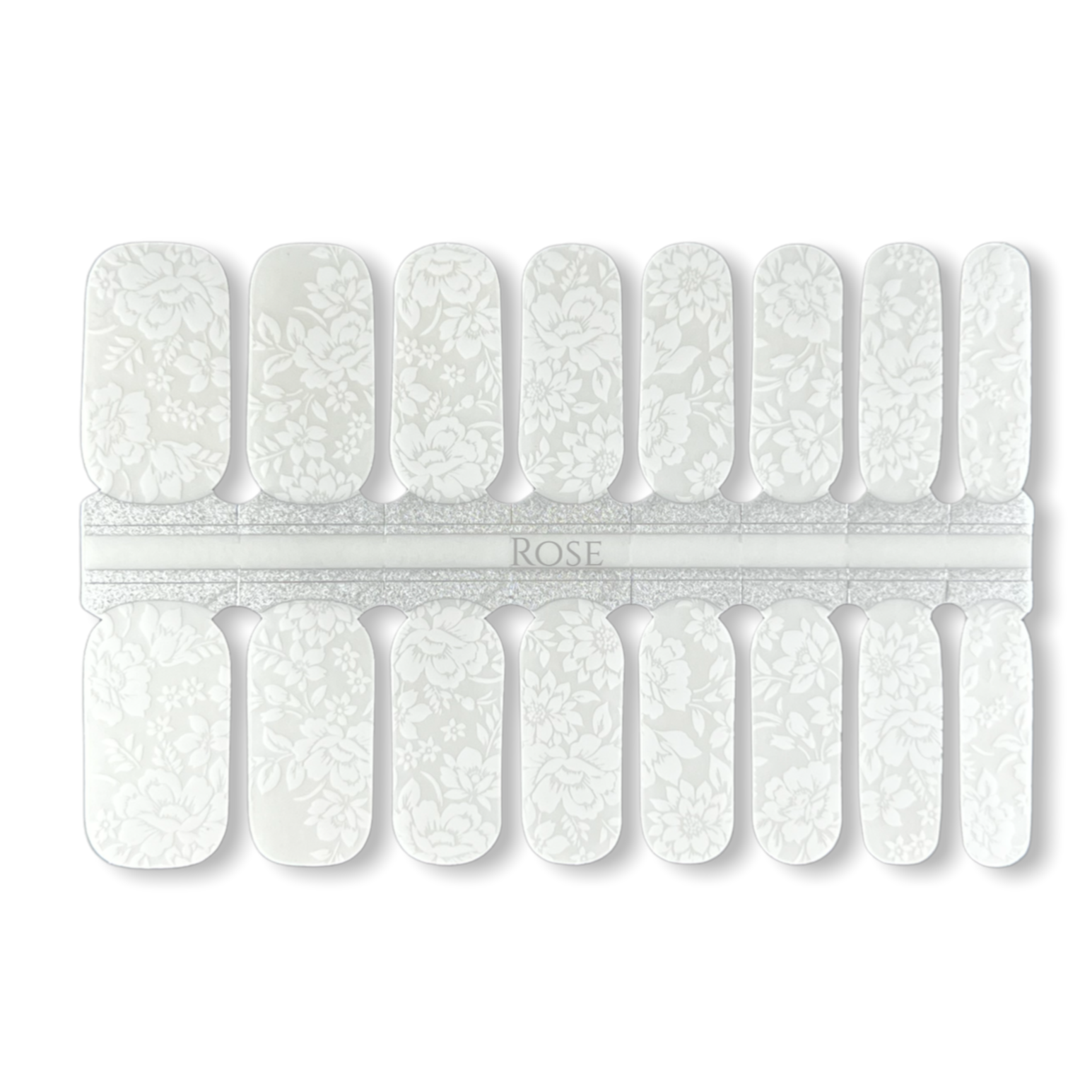 16 REAL NAIL POLISH STRIPS FEATURING A WHITE ROSE DESIGN OVER A TRANSPARENT BASE