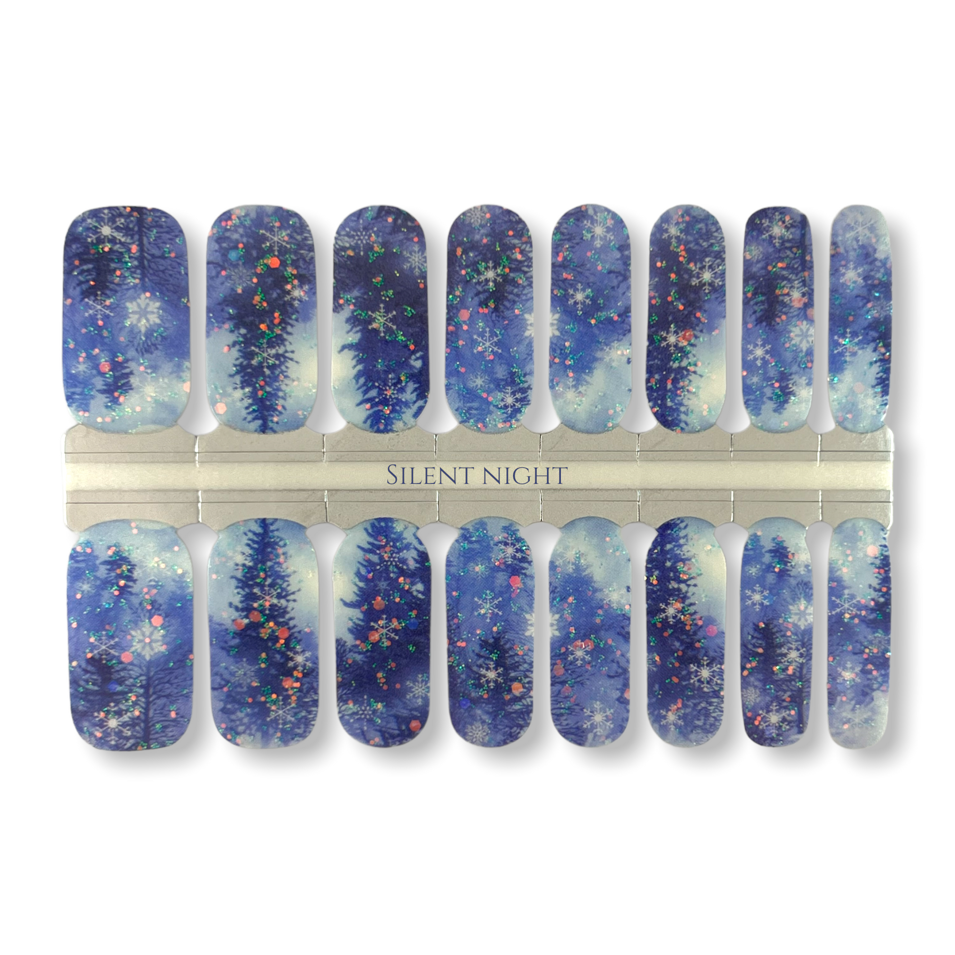 16 REAL NAIL POLISH STRIPS IN A PEARL FINISH WITH GENTLE WHITE SNOWFLAKES AND DARK BLUE PINE TREE SILHOUETTES