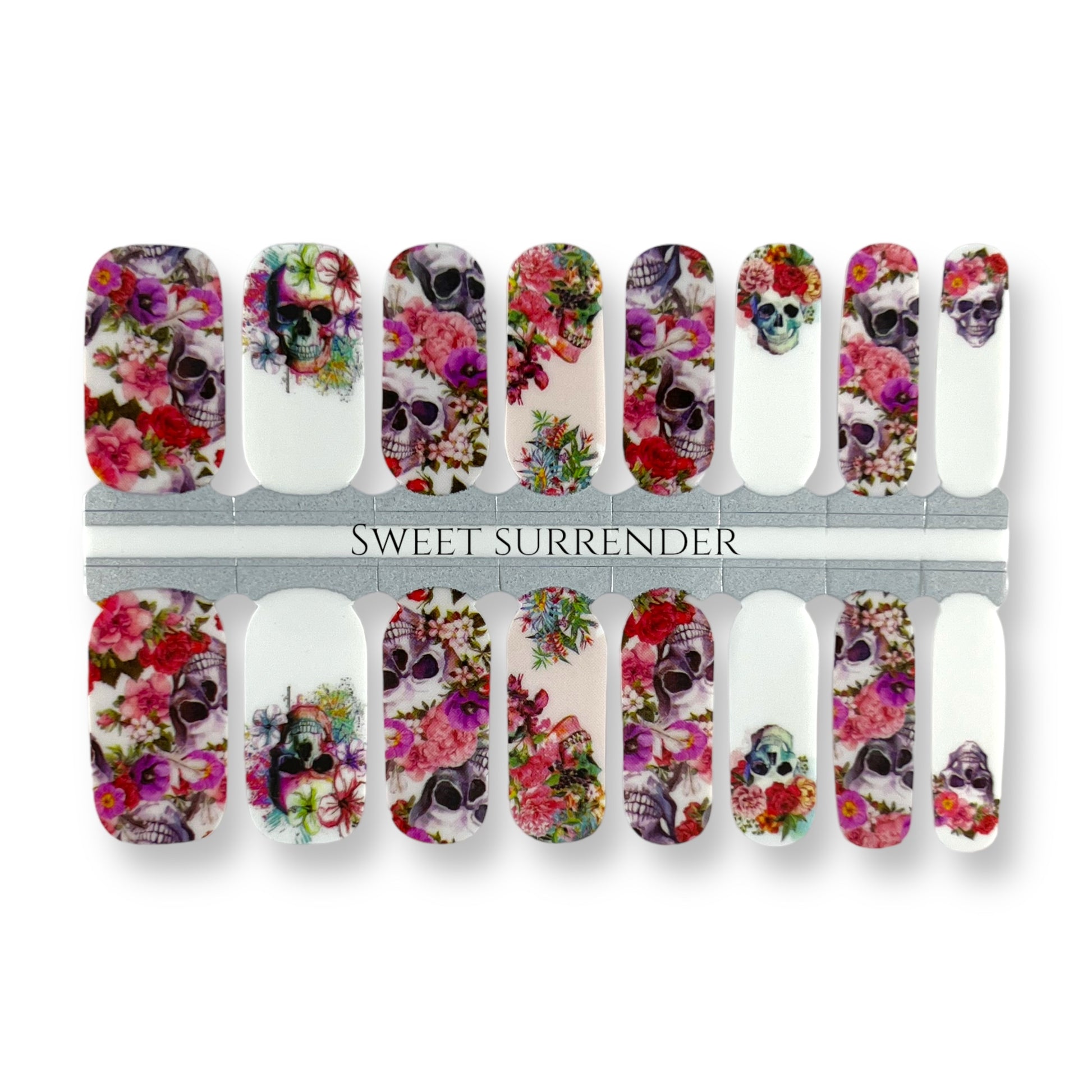 FEATURING A SKULL AND COLOURFUL FLORAL DESIGN ON SHADES OF WARM WHITE BASE