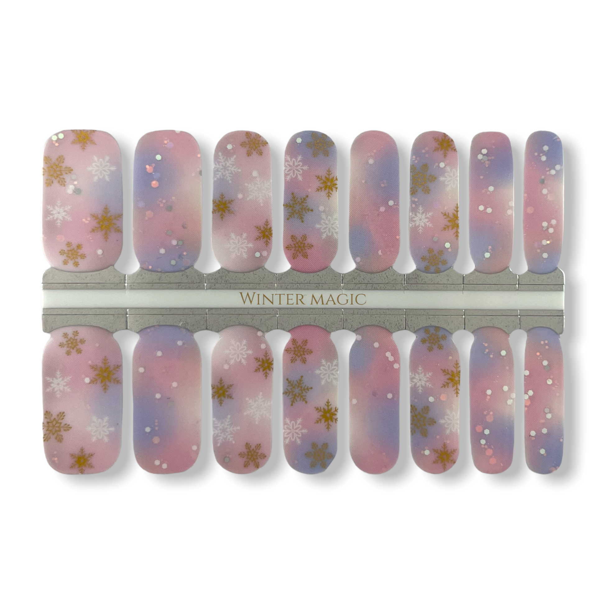 16 REAL NAIL POLISH STRIPS IN SOFT PINKS AND BLUES WITH WHITE AND GOLD METALLIC SNOWFLAKES AND A LIGHT SPRINKLING OF HOLOGRAPHIC GLITTER IN A CREAM FINISH